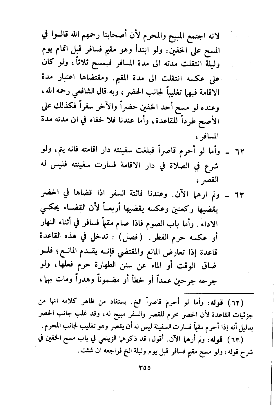 62 - وَأَمَّا لَوْ أَحْرَمَ قَاصِرًا فَبَلَغَتْ سَفِينَتُهُ دَارَ إقَامَتِهِ فَإِنَّهُ يُتِمُّ، وَلَوْ شَرَعَ فِي الصَّلَاةِ فِي دَارِ الْإِقَامَةِ فَسَارَتْ سَفِينَتُهُ فَلَيْسَ لَهُ الْقَصْرُ، 63 - وَلَمْ أَرَهُمَا الْآنَ.