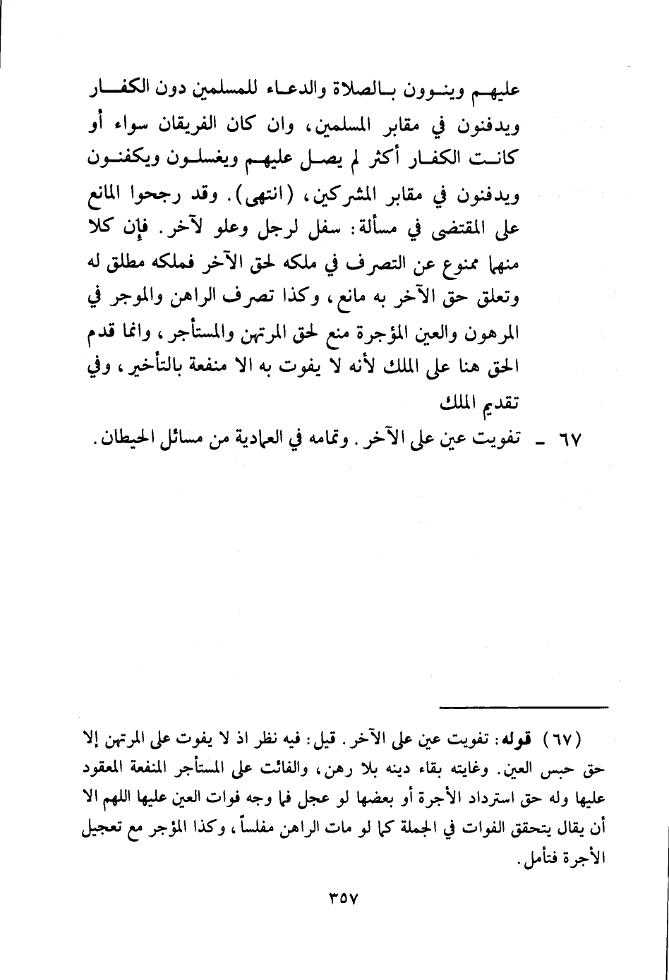 وَقَدْ رَجَّحُوا الْمَانِعَ عَلَى الْمُقْتَضِي فِي مَسْأَلَةِ: سُفْلٌ لِرَجُلٍ، وَعُلُوٌّ لِآخَرَ فَإِنْ كُلًّا مِنْهُمَا مَمْنُوعٌ عَنْ التَّصَرُّفِ فِي مِلْكِهِ لِحَقِّ الْآخَرِ فَمِلْكُهُ مُطْلَقٌ لَهُ، وَتَعَلُّقُ حَقِّ الْآخَرِ بِهِ مَانِعٌ، وَكَذَا تَصَرُّفُ الرَّاهِنِ، وَالْمُؤَجِّرِ فِي الْمَرْهُونِ، وَالْعَيْنِ الْمُؤَجَّرَةِ مَنْعٌ لِحَقِّ الْمُرْتَهِنِ، وَالْمُسْتَأْجِرِ، وَإِنَّمَا قُدِّمَ الْحَقُّ هُنَا عَلَى الْمِلْكِ؛ لِأَنَّهُ لَا يَفُوتُ بِهِ إلَّا مَنْفَعَةٌ بِالتَّأْخِيرِ، وَفِي تَقْدِيمِ الْمِلْكِ 67 - تَفْوِيتُ عَيْنٍ عَلَى الْآخَرِ.