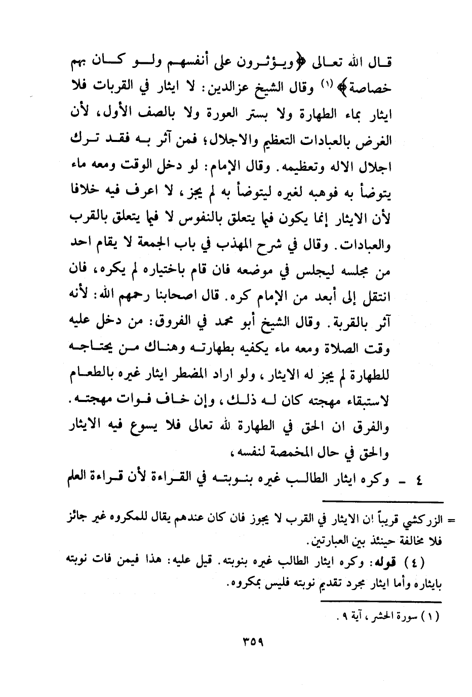 قَالَ اللَّهُ تَعَالَى {وَيُؤْثِرُونَ عَلَى أَنْفُسِهِمْ وَلَوْ كَانَ بِهِمْ خَصَاصَةٌ} [الحشر: 9] ، وَقَالَ الشَّيْخُ عِزُّ الدِّينِ: لَا إيثَارَ فِي الْقُرُبَاتِ فَلَا إيثَارَ بِمَاءِ الطَّهَارَةِ، وَلَا بِسَتْرِ الْعَوْرَةِ، وَلَا بِالصَّفِّ الْأَوَّلِ؛ لِأَنَّ الْغَرَضَ بِالْعِبَادَاتِ التَّعْظِيمُ، وَالْإِجْلَالُ؛ فَمَنْ آثَرَ بِهِ فَقَدْ تَرَكَ إجْلَالَ الْإِلَهِ، وَتَعْظِيمَهُ.