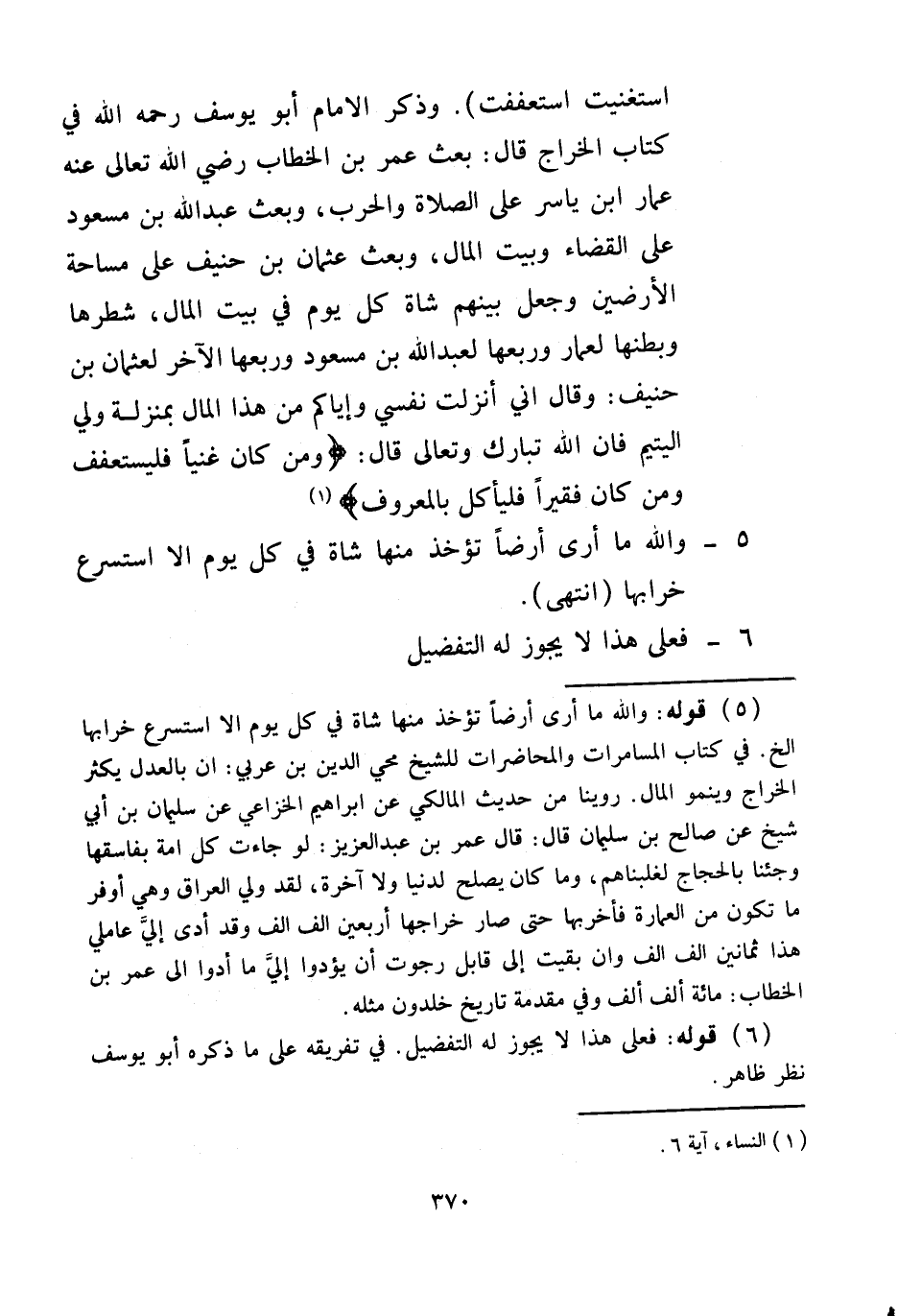وَذَكَرَ الْإِمَامُ أَبُو يُوسُفَ - رَحِمَهُ اللَّهُ - فِي كِتَابِ الْخَرَاجِ قَالَ: بَعَثَ عُمَرُ بْنُ الْخَطَّابِ - رَضِيَ اللَّهُ تَعَالَى عَنْهُ - عَمَّارَ بْنَ يَاسِرٍ عَلَى الصَّلَاةِ وَالْحَرْبِ، وَبَعَثَ عَبْدَ اللَّهِ بْنَ مَسْعُودٍ عَلَى الْقَضَاءِ وَبَيْتِ الْمَالِ، وَبَعَثَ عُثْمَانَ بْنَ حُنَيْفٍ عَلَى مِسَاحَةِ الْأَرْضِينَ، وَجَعَلَ بَيْنَهُمْ شَاةً كُلَّ يَوْمٍ فِي بَيْتِ الْمَالِ، شَطْرُهَا، وَبَطْنُهَا لِعَمَّارٍ، وَرُبُعُهَا لِعَبْدِ اللَّهِ بْنِ مَسْعُودٍ، وَرُبُعُهَا الْآخَرُ لِعُثْمَانَ بْنِ حُنَيْفٍ: وَقَالَ إنِّي أَنْزَلْت نَفْسِي، وَإِيَّاكُمْ مِنْ هَذَا الْمَالِ بِمَنْزِلَةِ وَلِيِّ الْيَتِيمِ فَإِنَّ اللَّهَ تَبَارَكَ وَتَعَالَى قَالَ: {وَمَنْ كَانَ غَنِيًّا فَلْيَسْتَعْفِفْ وَمَنْ كَانَ فَقِيرًا فَلْيَأْكُلْ بِالْمَعْرُوفِ} [النساء: 6]- وَاَللَّهِ مَا أَرَى أَرْضًا تُؤْخَذُ مِنْهَا شَاةٌ فِي كُلِّ يَوْمٍ إلَّا اُسْتُسْرِعَ خَرَابُهَا (انْتَهَى) .