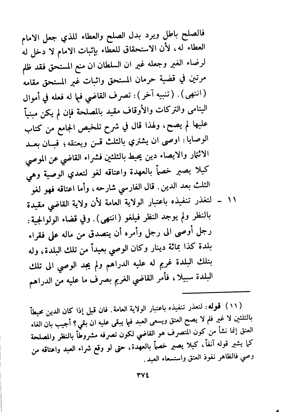 (تَنْبِيهٌ آخَرُ) : تَصَرُّفُ الْقَاضِي فِيمَا لَهُ فِعْلُهُ فِي أَمْوَالِ الْيَتَامَى، وَالتَّرِكَاتِ، وَالْأَوْقَافِ مُقَيَّدٌ بِالْمَصْلَحَةِ فَإِنْ لَمْ يَكُنْ مَبْنِيًّا عَلَيْهَا لَمْ يَصِحَّ، وَلِهَذَا قَالَ فِي شَرْحِ تَلْخِيصِ الْجَامِعِ مِنْ كِتَابِ الْوَصَايَا: أَوْصَى أَنْ يَشْتَرِيَ بِالثُّلُثِ قِنًّا، وَيَعْتِقَهُ؛ فَبَانَ بَعْدَ الِائْتِمَارِ، وَالْإِيصَاءِ دَيْنٌ يُحِيطُ بِالثُّلُثَيْنِ فَشِرَاءُ الْقَاضِي عَنْ الْمُوصِي كَيْ لَا يَصِيرَ خَصْمًا بِالْعُهْدَةِ، وَإِعْتَاقُهُ لَغْوٌ لِتَعَدِّي الْوَصِيَّةِ، وَهِيَ الثُّلُثُ بَعْدَ الدَّيْنِ.