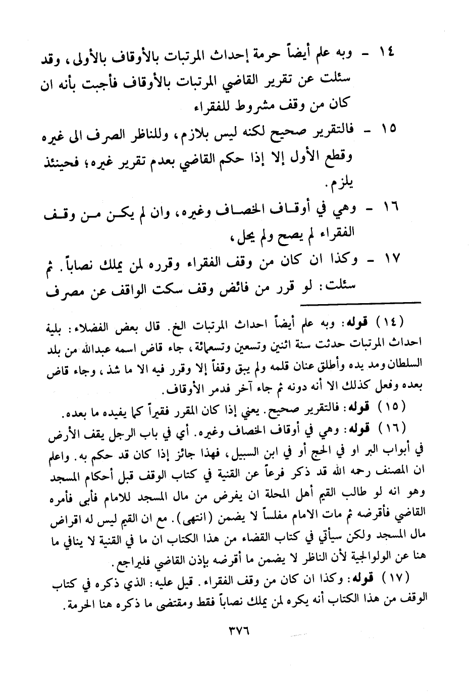 وَبِهِ عُلِمَ أَيْضًا حُرْمَةُ إحْدَاثِ الْمُرَتَّبَاتِ بِالْأَوْقَافِ بِالْأَوْلَى، وَقَدْ سُئِلْتُ عَنْ تَقْرِيرِ الْقَاضِي الْمُرَتَّبَاتِ بِالْأَوْقَافِ فَأَجَبْت بِأَنَّهُ إنْ كَانَ مِنْ وَقْفٍ مَشْرُوطٍ لِلْفُقَرَاءِ 15 - فَالتَّقْرِيرُ صَحِيحٌ لَكِنَّهُ لَيْسَ بِلَازِمٍ، وَلِلنَّاظِرِ الصَّرْفُ إلَى غَيْرِهِ، وَقَطْعُ الْأَوَّلِ إلَّا إذَا حَكَمَ الْقَاضِي بِعَدَمِ تَقْرِيرِ غَيْرِهِ؛ فَحِينَئِذٍ يَلْزَمُ.