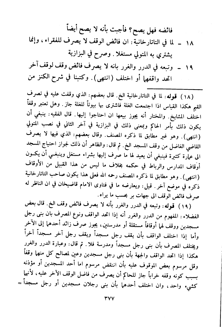 فَائِضِهِ فَهَلْ يَصِحُّ؟ فَأَجَبْت بِأَنَّهُ لَا يَصِحُّ أَيْضًا 18 -؛ لِمَا فِي التَّتَارْخَانِيَّة: إنَّ فَائِضَ الْوَقْفِ لَا يُصْرَفُ لِلْفُقَرَاءِ، وَإِنَّمَا يَشْتَرِي بِهِ الْمُتَوَلِّي مُسْتَغَلَّا.