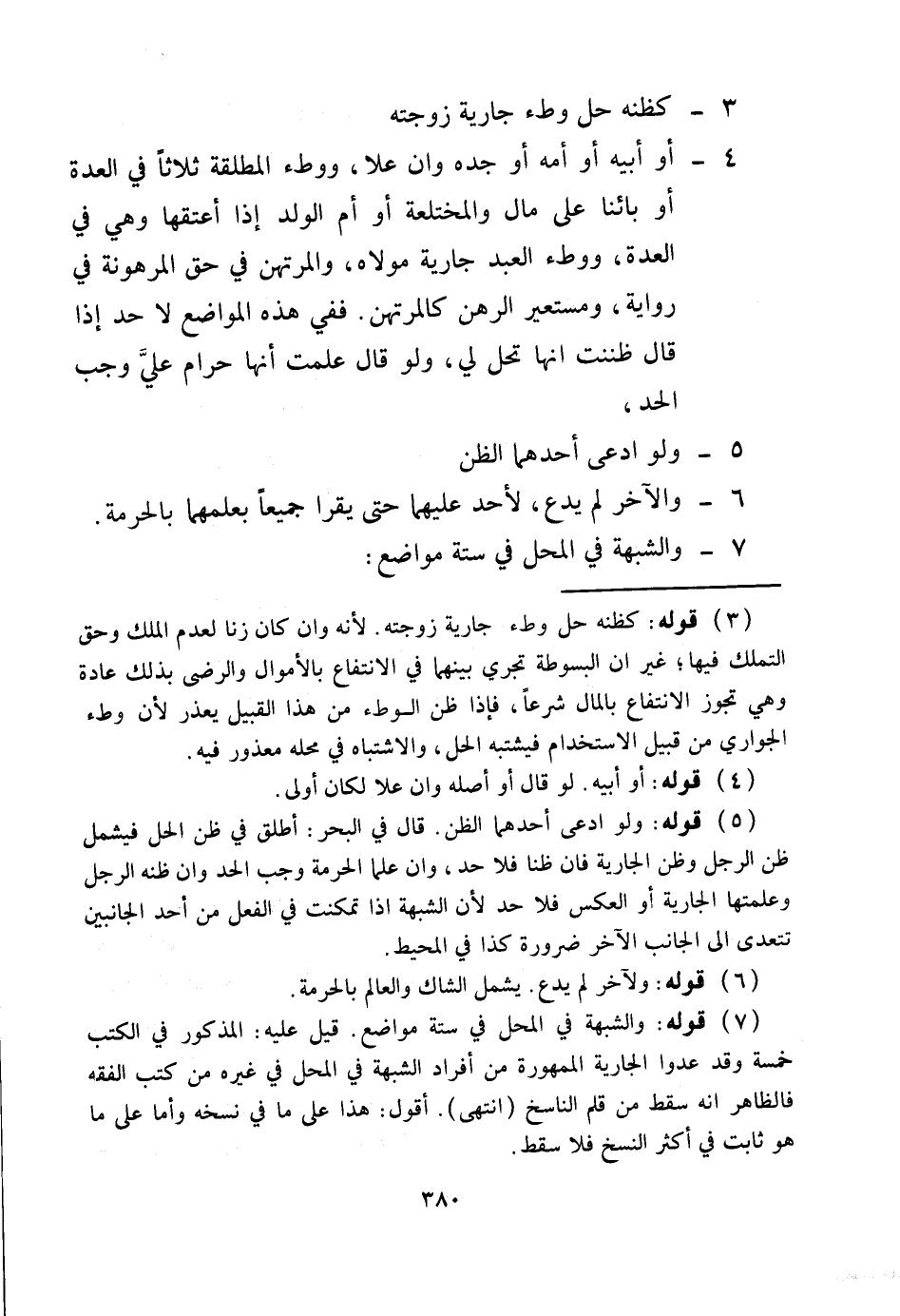 (7) قَوْلُهُ: وَالشُّبْهَةُ فِي الْمَحَلِّ فِي سِتَّةِ مَوَاضِعَ: قِيلَ عَلَيْهِ: الْمَذْكُورُ فِي الْكُتُبِ خَمْسَةٌ، وَقَدْ عَدُّوا الْجَارِيَةَ الْمَمْهُورَةَ مِنْ أَفْرَادِ الشُّبْهَةِ فِي الْمَحَلِّ فِي غَيْرِهِ مِنْ كُتُبِ الْفِقْهِ فَالظَّاهِرُ أَنَّهُ سَقْطٌ مِنْ قَلَمِ النَّاسِخِ (انْتَهَى) .