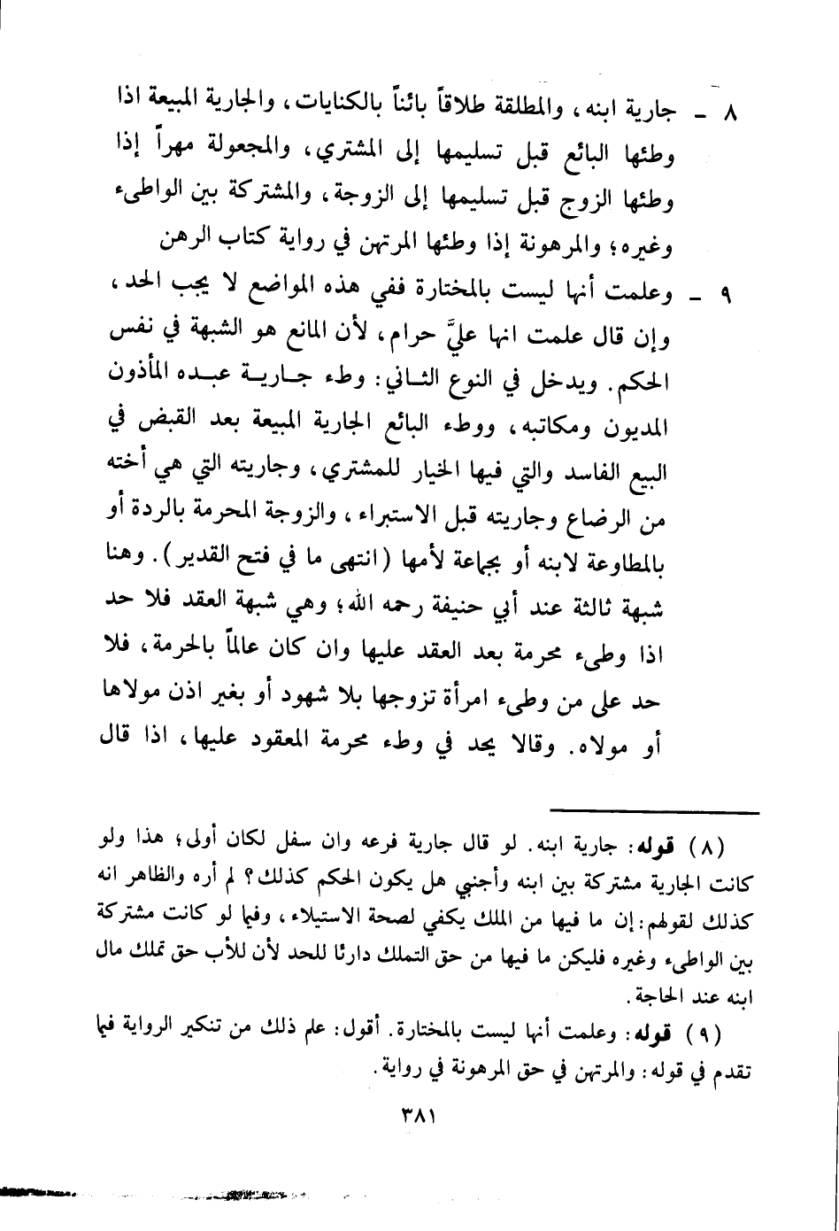 جَارِيَةُ ابْنِهِ، وَالْمُطَلَّقَةُ طَلَاقًا بَائِنًا بِالْكِنَايَاتِ،، وَالْجَارِيَةُ الْمَبِيعَةُ إذَا، وَطِئَهَا الْبَائِعُ قَبْلَ تَسْلِيمِهَا إلَى الْمُشْتَرِي،، وَالْمَجْعُولَةُ مَهْرًا إذَا وَطِئَهَا الزَّوْجُ قَبْلَ تَسْلِيمِهَا إلَى الزَّوْجَةِ، وَالْمُشْتَرَكَةُ بَيْنَ الْوَاطِئِ وَغَيْرِهِ، وَالْمَرْهُونَةُ إذَا وَطِئَهَا الْمُرْتَهِنُ فِي رِوَايَةِ كِتَابِ الرَّهْنِ 9 -، وَعَلِمَتْ أَنَّهَا لَيْسَتْ بِالْمُخْتَارَةِ فَفِي هَذِهِ الْمَوَاضِعِ لَا يَجِبُ الْحَدُّ، وَإِنْ قَالَ: عَلِمْت أَنَّهَا عَلَيَّ حَرَامٌ؛ لِأَنَّ الْمَانِعَ هُوَ الشُّبْهَةُ فِي نَفْسِ الْحُكْمِ.