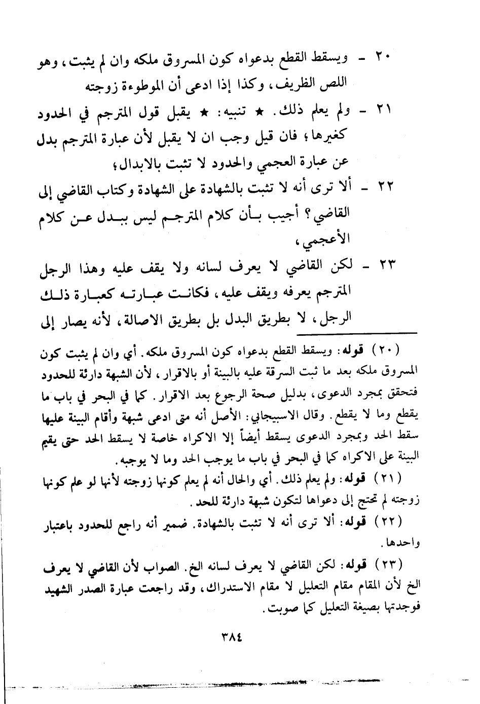 . تَنْبِيهٌ: يُقْبَلُ قَوْلُ الْمُتَرْجِمِ فِي الْحُدُودِ كَغَيْرِهَا؛ فَإِنْ قِيلَ: وَجَبَ أَنْ لَا يُقْبَلَ؛ لِأَنَّ عِبَارَةَ الْمُتَرْجِمِ بَدَلٌ عَنْ عِبَارَةِ الْعَجَمِيِّ، وَالْحُدُودُ لَا تَثْبُتُ بِالْأَبْدَالِ؛ 22 - أَلَا تَرَى أَنَّهُ لَا تَثْبُتُ بِالشَّهَادَةِ عَلَى الشَّهَادَةِ، وَكِتَابِ الْقَاضِي إلَى الْقَاضِي؟ أُجِيبُ بِأَنَّ كَلَامَ الْمُتَرْجِمِ لَيْسَ بِبَدَلٍ عَنْ كَلَامِ الْأَعْجَمِيِّ، 23 - لَكِنَّ الْقَاضِيَ لَا يَعْرِفُ لِسَانَهُ، وَلَا يَقِفُ عَلَيْهِ، وَهَذَا الرَّجُلُ الْمُتَرْجِمُ يَعْرِفُهُ، وَيَقِفُ عَلَيْهِ، فَكَانَتْ عِبَارَتُهُ كَعِبَارَةِ ذَلِكَ الرَّجُلِ، لَا بِطَرِيقِ الْبَدَلِ بَلْ بِطَرِيقِ الْأَصَالَةِ؛ لِأَنَّهُ يُصَارُ إلَى