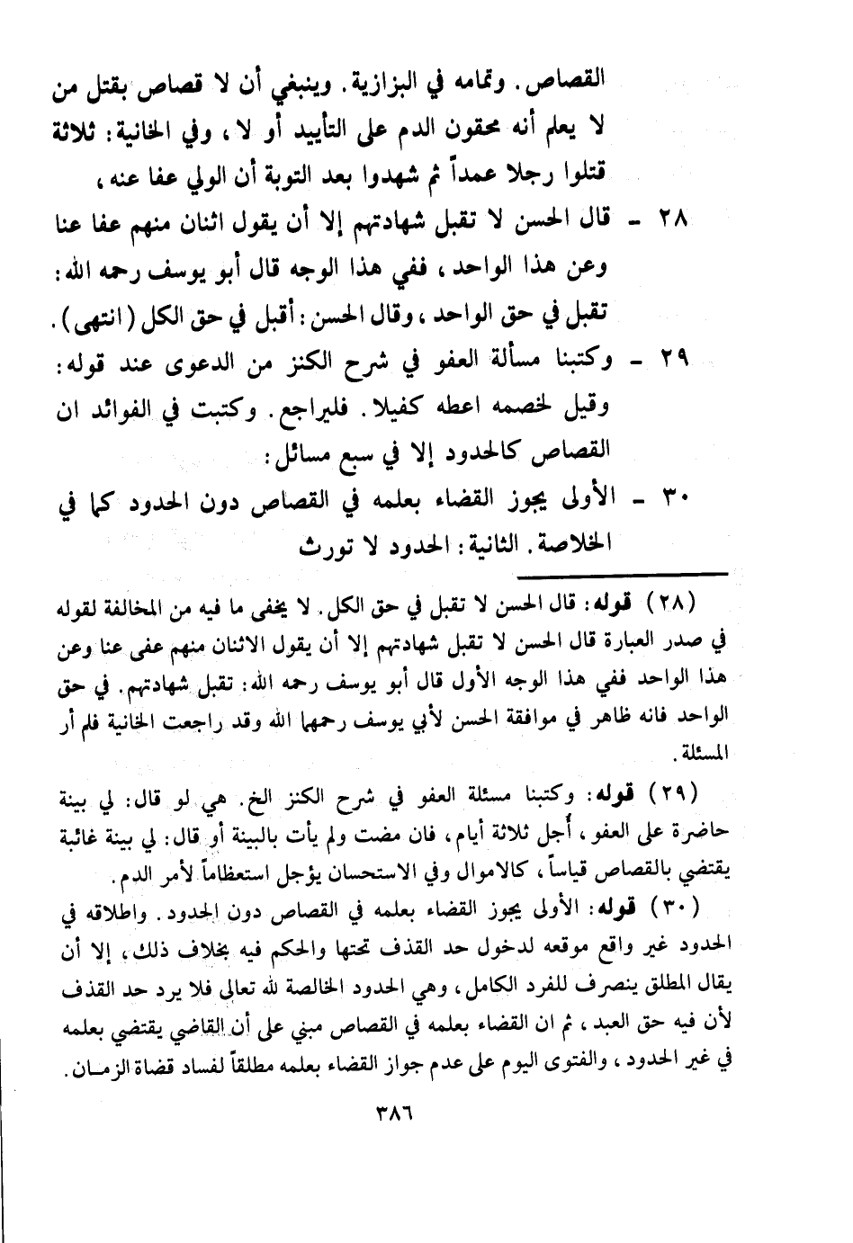 ، وَكَتَبْت فِي الْفَوَائِدِ أَنَّ الْقِصَاصَ كَالْحُدُودِ إلَّا فِي سَبْعِ مَسَائِلَ: 30 - الْأُولَى: يَجُوزُ الْقَضَاءُ بِعِلْمِهِ فِي الْقِصَاصِ دُونَ الْحُدُودِ كَمَا فِي الْخُلَاصَةِ.