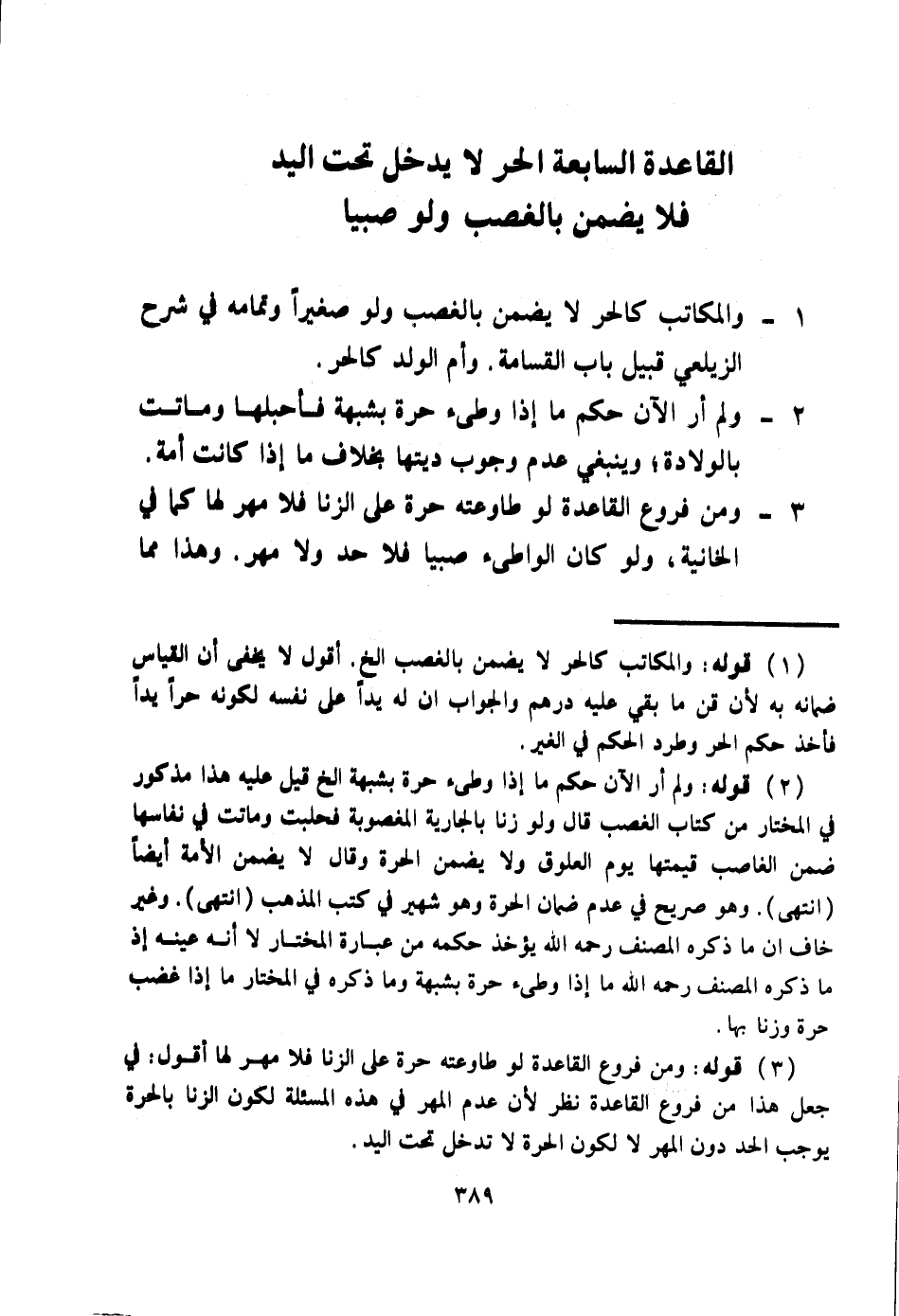 ـــــــــــــــــــــــــــــQ [الْقَاعِدَةُ السَّابِعَةُ الْحُرُّ لَا يَدْخُلُ تَحْتَ الْيَدِ فَلَا يُضْمَنُ بِالْغَصْبِ وَلَوْ صَبِيًّا]