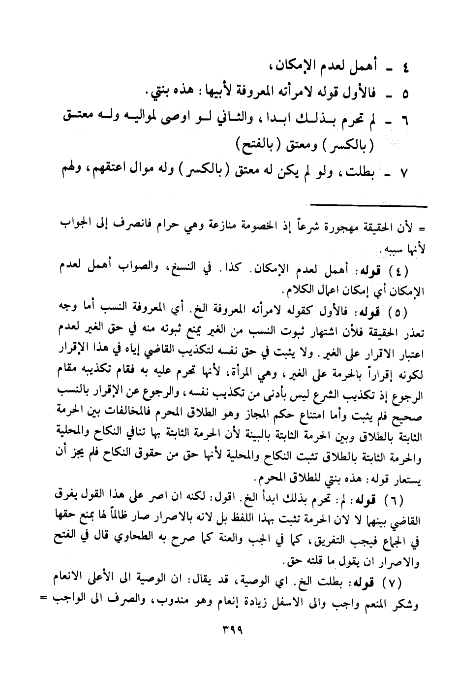 أُهْمِلُ لِعَدَمِ الْإِمْكَانِ، 5 - فَالْأَوَّلُ قَوْلُهُ لِامْرَأَتِهِ الْمَعْرُوفَةِ لِأَبِيهَا: هَذِهِ بِنْتِي 6 -؛ لَمْ تُحَرَّمْ بِذَلِكَ أَبَدًا.