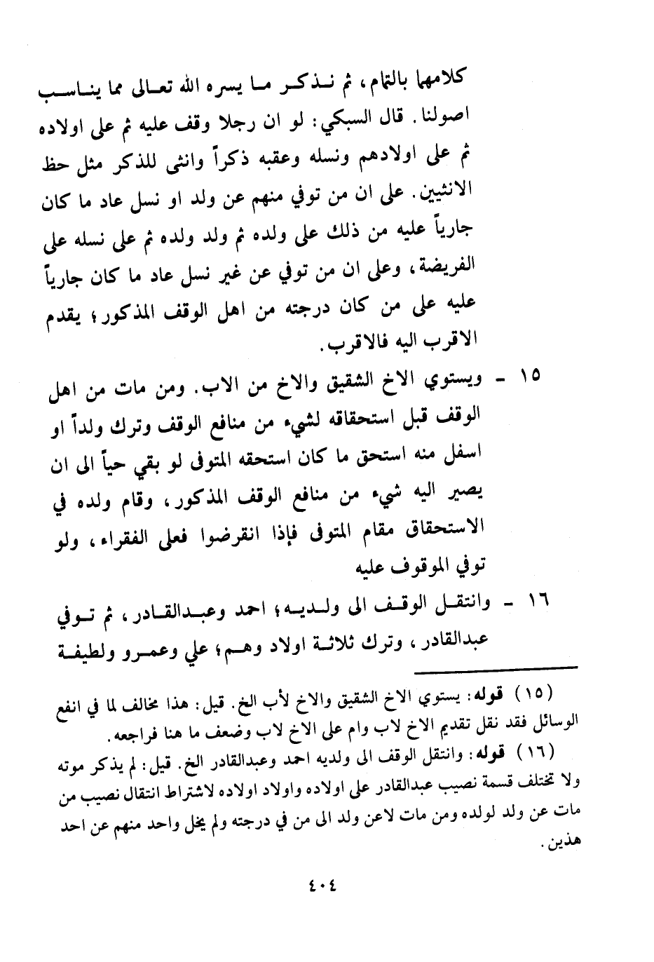 (16) قَوْلُهُ: وَانْتَقَلَ الْوَقْفُ إلَى وَلَدَيْهِ أَحْمَدَ وَعَبْدِ الْقَادِرِ إلَخْ. قِيلَ: لَمْ يَذْكُرْ مَوْتَهُ وَلَا تَخْتَلِفُ قِسْمَةُ نَصِيبِ عَبْدِ الْقَادِرِ عَلَى أَوْلَادِهِ وَأَوْلَادِ أَوْلَادِهِ لِاشْتِرَاطِ انْتِقَالِ نَصِيبِ مَنْ مَاتَ عَنْ وَلَدٍ لِوَلَدِهِ وَمَنْ مَاتَ لَا عَنْ وَلَدٍ إلَى مَنْ فِي دَرَجَتِهِ وَلَمْ يَخْلُ وَاحِدٌ مِنْهُمْ عَنْ أَحَدِ هَذَيْنِ
