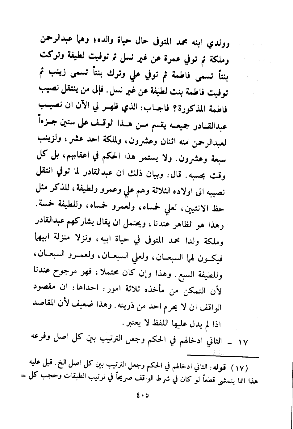 وَوَلَدَيْ ابْنِهِ مُحَمَّدٍ الْمُتَوَفَّى حَالَ حَيَاةِ وَالِدِهِ؛ وَهُمَا عَبْدُ الرَّحْمَنِ وَمَلَكَةُ، ثُمَّ تُوُفِّيَ عَمْرٌو عَنْ غَيْرِ نَسْلٍ ثُمَّ تُوُفِّيَتْ لَطِيفَةُ وَتَرَكَتْ بِنْتًا تُسَمَّى فَاطِمَةَ، ثُمَّ تُوُفِّيَ عَلَيَّ وَتَرَكَ بِنْتًا تُسَمَّى زَيْنَبَ، ثُمَّ تُوُفِّيَتْ فَاطِمَةُ بِنْتُ لَطِيفَةَ عَنْ غَيْرِ نَسْلٍ. فَإِلَى مَنْ يَنْتَقِلُ نَصِيبُ فَاطِمَةَ الْمَذْكُورَةِ.؟ فَأَجَابَ: الَّذِي ظَهَرَ لِي الْآنَ أَنَّ نَصِيبَ عَبْدِ الْقَادِرِ جَمِيعَهُ يُقَسَّمُ مِنْ هَذَا الْوَقْفِ عَلَى سِتِّينَ جُزْءًا لِعَبْدِ الرَّحْمَنِ مِنْهُ اثْنَانِ وَعِشْرُونَ، وَلِمَلَكَةَ أَحَدَ عَشَرَ، وَلِزَيْنَبِ سَبْعَةٌ وَعِشْرُونَ. وَلَا يَسْتَمِرُّ هَذَا الْحُكْمُ فِي أَعْقَابِهِمْ، بَلْ كُلُّ وَقْتٍ بِحَسْبِهِ. قَالَ: وَبَيَانُ ذَلِكَ أَنَّ عَبْدَ الْقَادِرِ لَمَّا تُوُفِّيَ انْتَقَلَ نَصِيبُهُ إلَى أَوْلَادِهِ الثَّلَاثَةِ وَهُمْ عَلِيٌّ وَعَمْرٌو وَلَطِيفَةُ، لِلذَّكَرِ مِثْلُ حَظِّ الْأُنْثَيَيْنِ، لِعَلِيٍّ خُمُسَاهُ، وَلِعَمْرٍو خُمُسَاهُ، وَلِلَطِيفَةَ خُمُسُهُ. وَهَذَا هُوَ الظَّاهِرُ عِنْدَنَا، وَيُحْتَمَلُ أَنْ يُقَالَ يُشَارِكُهُمْ عَبْدُ الْقَادِرِ وَمَلَكَةُ وَلَدَا مُحَمَّدٍ الْمُتَوَفَّى فِي حَيَاةِ أَبِيهِ، وَنَزَلَا مَنْزِلَةَ أَبِيهِمَا فَيَكُونُ لَهُمَا السُّبُعَانِ، وَلِعَلِيٍّ السُّبُعَانِ، وَلِعَمْرٍو السُّبُعَانِ، وَلِلَطِيفَةَ السُّبُعُ. وَهَذَا وَإِنْ كَانَ مُحْتَمَلًا، فَهُوَ مَرْجُوحٌ عِنْدَنَا لِأَنَّ التَّمَكُّنَ مِنْ مَأْخَذِهِ ثَلَاثَةُ أُمُورٍ: إحْدَاهَا: أَنَّ مَقْصُودَ الْوَاقِفِ أَنْ لَا يُحْرَمَ أَحَدٌ مِنْ ذُرِّيَّتِهِ. وَهَذَا ضَعِيفٌ لِأَنَّ الْمَقَاصِدَ إذَا لَمْ يَدُلَّ عَلَيْهَا اللَّفْظُ لَا يُعْتَبَرُ. 17 -
