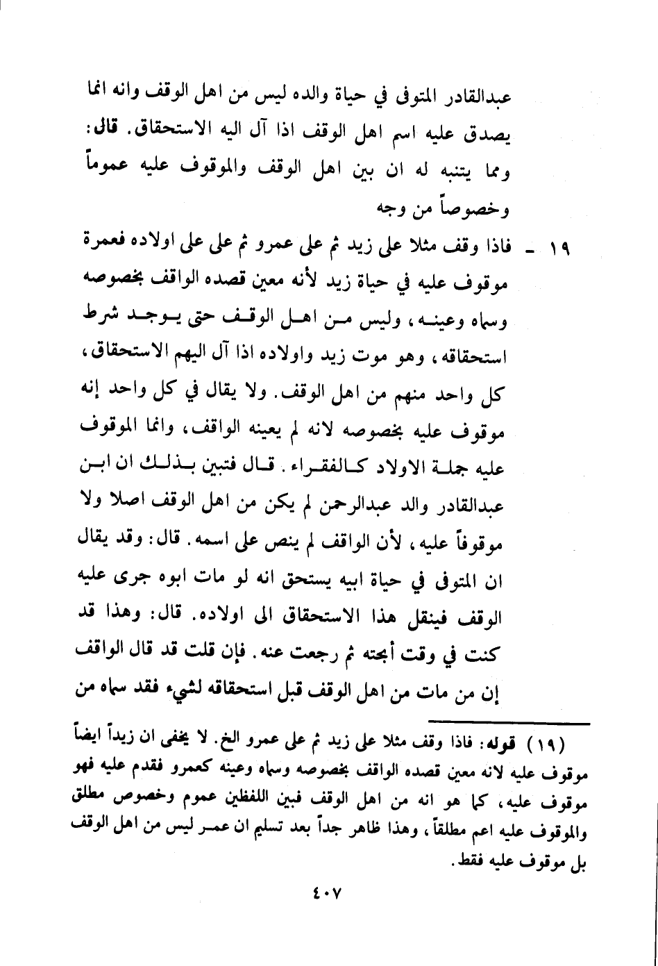 19 - فَإِذَا وَقَفَ مَثَلًا عَلَى زَيْدٍ ثُمَّ عَلَى عَمْرٍو ثُمَّ عَلَى أَوْلَادِهِ فَعَمْرٌو مَوْقُوفٌ عَلَيْهِ فِي حَيَاةِ زَيْدٍ لِأَنَّهُ مُعَيَّنٌ قَصَدَهُ الْوَاقِفُ بِخُصُوصِهِ وَسَمَّاهُ وَعَيَّنَهُ، وَلَيْسَ مِنْ أَهْلِ الْوَقْفِ حَتَّى يُوجَدَ شَرْطُ اسْتِحْقَاقِهِ، وَهُوَ مَوْتُ زَيْدٍ وَأَوْلَادِهِ إذَا آلَ إلَيْهِمْ الِاسْتِحْقَاقُ، كُلُّ وَاحِدٍ مِنْهُمْ مِنْ أَهْلِ الْوَقْفِ. وَلَا يُقَالُ فِي كُلِّ وَاحِدٍ إنَّهُ مَوْقُوفٌ عَلَيْهِ بِخُصُوصِهِ لِأَنَّهُ لَمْ يُعَيِّنْهُ الْوَاقِفُ، وَإِنَّمَا الْمَوْقُوفُ عَلَيْهِ جُمْلَةُ الْأَوْلَادِ كَالْفُقَرَاءِ. قَالَ: فَتَبَيَّنَ بِذَلِكَ أَنَّ ابْنَ عَبْدِ الْقَادِرِ وَالِدِ عَبْدِ الرَّحْمَنِ لَمْ يَكُنْ مِنْ أَهْلِ الْوَقْفِ أَصْلًا وَلَا مَوْقُوفًا عَلَيْهِ، لِأَنَّ الْوَاقِفَ لَمْ يَنُصَّ عَلَى اسْمِهِ. قَالَ: وَقَدْ يُقَالُ: إنَّ الْمُتَوَفَّى فِي حَيَاةِ أَبِيهِ يَسْتَحِقُّ أَنَّهُ لَوْ مَاتَ أَبُوهُ جَرَى عَلَيْهِ الْوَقْفُ فَيُنْقَلُ هَذَا الِاسْتِحْقَاقُ إلَى أَوْلَادِهِ. قَالَ: وَهَذَا قَدْ كُنْتُ فِي وَقْتٍ أَبَحْتُهُ ثُمَّ رَجَعْتُ عَنْهُ. فَإِنْ قُلْتَ: قَدْ قَالَ الْوَاقِفُ إنَّ مَنْ مَاتَ عَنْ أَهْلِ الْوَقْفِ قَبْلَ اسْتِحْقَاقِهِ لِشَيْءٍ فَقَدْ سَمَّاهُ مِنْ