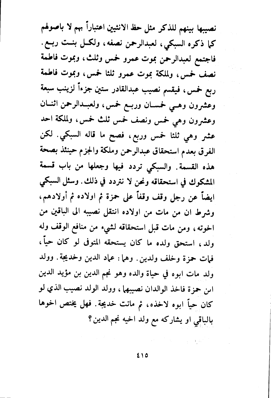 نَصِيبُهَا بَيْنَهُمْ لِلذَّكَرِ مِثْلُ حَظِّ الْأُنْثَيَيْنِ اعْتِبَارًا بِهِمْ لَا بِأُصُولِهِمْ كَمَا ذَكَرَهُ السُّبْكِيُّ، لِعَبْدِ الرَّحْمَنِ نِصْفُهُ، وَلِكُلِّ بِنْتٍ رُبْعٌ. فَاجْتَمَعَ لِعَبْدِ الرَّحْمَنِ بِمَوْتِ عَمْرٍو خُمُسٌ وَثُلُثٌ، وَبِمَوْتِ فَاطِمَةَ نِصْفُ خُمُسٍ، وَلِمَلَكَةَ بِمَوْتِ عَمْرٍو ثُلُثَا خُمُسٍ، وَبِمَوْتِ فَاطِمَةَ رُبْعُ خُمُسٍ، فَيُقَسَّمُ نَصِيبُ عَبْدِ الْقَادِرِ سِتِّينَ جُزْءًا لِزَيْنَبِ سَبْعَةٌ وَعِشْرُونَ وَهِيَ خُمُسَانِ وَرُبْعُ خُمُسٍ، وَلِعَبْدِ الرَّحْمَنِ اثْنَانِ وَعِشْرُونَ وَهِيَ خُمُسٌ وَنِصْفُ خُمُسٍ وَثُلُثُ خُمُسٍ، وَلِمَلَكَةَ أَحَدَ عَشَرَ وَهِيَ ثُلُثَا خُمُسٍ وَرُبْعٍ، فَصَحَّ مَا قَالَهُ السُّبْكِيُّ. لَكِنَّ الْفَرْقَ بِعَدَمِ اسْتِحْقَاقِ عَبْدِ الرَّحْمَنِ وَمَلَكَةَ وَالْجَزْمَ حِينَئِذٍ بِصِحَّةِ هَذِهِ الْقِسْمَةِ.