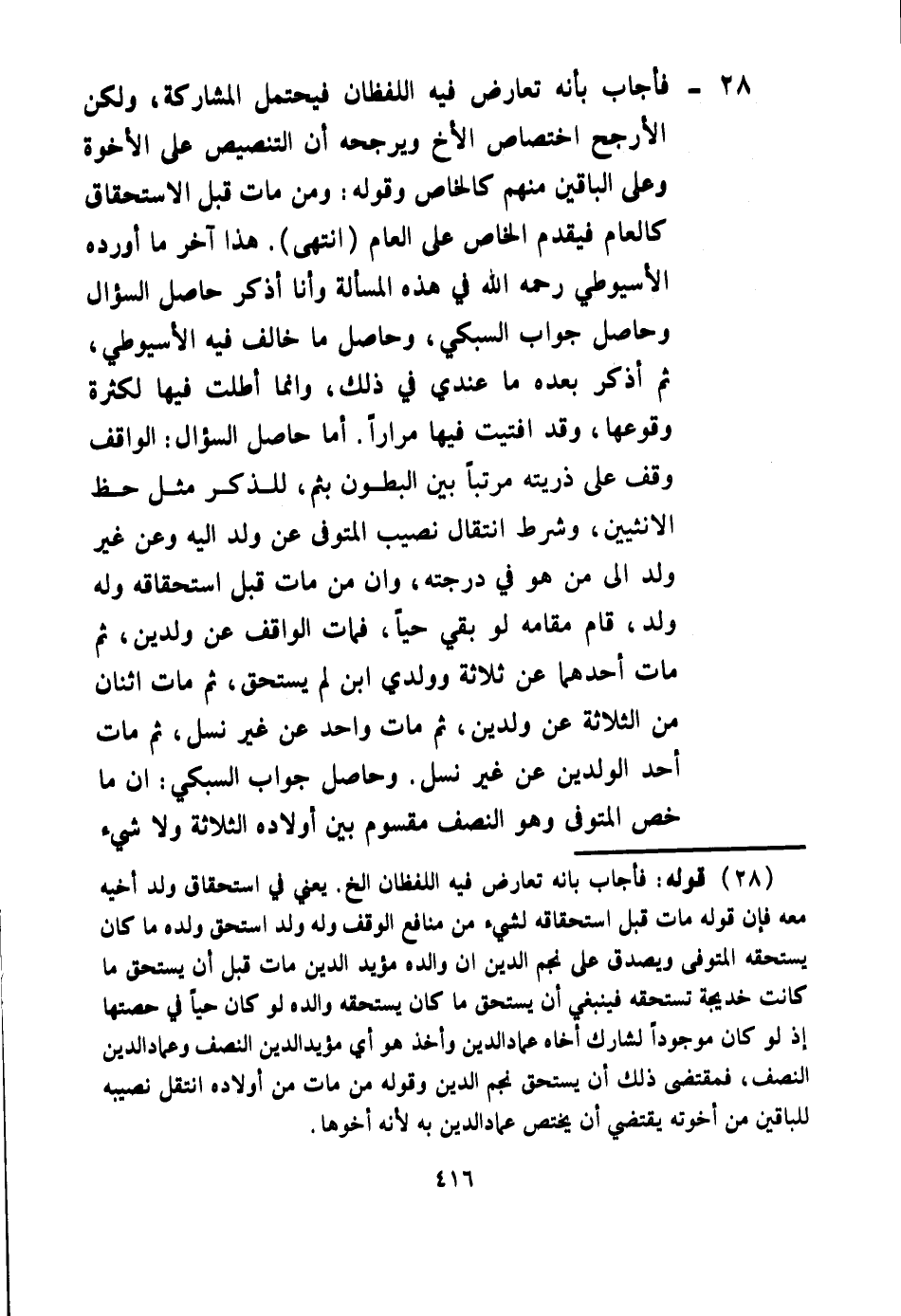 فَأَجَابَ بِأَنَّهُ تَعَارَضَ فِيهِ اللَّفْظَانِ فَيَحْتَمِلُ الْمُشَارَكَةَ، وَلَكِنَّ الْأَرْجَحَ اخْتِصَاصُ الْأَخِ وَيُرَجِّحُهُ أَنَّ التَّنْصِيصَ عَلَى الْأُخُوَّةِ وَعَلَى الْبَاقِينَ مِنْهُمْ كَالْخَاصِّ وَقَوْلُهُ: وَمَنْ مَاتَ قَبْلَ الِاسْتِحْقَاقِ كَالْعَامِّ فَيُقَدَّمُ الْخَاصُّ عَلَى الْعَامِّ (انْتَهَى) . هَذَا آخِرُ مَا أَوْرَدَهُ الْأَسْيُوطِيُّ - رَحِمَهُ اللَّهُ - فِي هَذِهِ الْمَسْأَلَةِ وَأَنَا أَذْكُرُ حَاصِلَ السُّؤَالِ وَحَاصِلَ جَوَابِ السُّبْكِيّ، وَحَاصِلَ مَا خَالَفَ فِيهِ الْأَسْيُوطِيَّ، ثُمَّ أَذْكُرُ بَعْدَهُ مَا عِنْدِي فِي ذَلِكَ، وَإِنَّمَا أَطَلْتُ فِيهَا لِكَثْرَةِ وُقُوعِهَا، وَقَدْ أَفْتَيْتُ فِيهَا مِرَارًا.