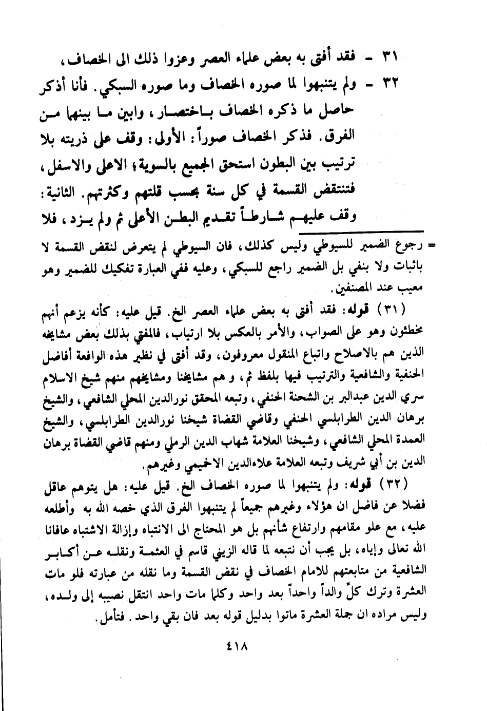 (32) قَوْلُهُ: وَلَمْ يَتَنَبَّهُوا لِمَا صَوَّرَهُ الْخَصَّافُ إلَخْ. قِيلَ عَلَيْهِ: هَلْ يَتَوَهَّمُ عَاقِلٌ فَضْلًا عَنْ فَاضِلٍ أَنَّ هَؤُلَاءِ وَغَيْرَهُمْ جَمِيعًا لَمْ يَتَنَبَّهُوا الْفَرْقَ الَّذِي خَصَّهُ اللَّهُ بِهِ وَأَطْلَعَهُ عَلَيْهِ، مَعَ عُلُوِّ مَقَامِهِمْ وَارْتِفَاعِ شَأْنِهِمْ بَلْ هُوَ الْمُحْتَاجُ إلَى الِانْتِبَاهِ وَإِزَالَةِ الِاشْتِبَاهِ عَافَانَا اللَّهُ تَعَالَى وَإِيَّاهُ، بَلْ يَجِبُ أَنْ نَتْبَعَهُ لِمَا قَالَهُ الزَّيْنِيُّ قَاسِمٌ فِي الْعَثْمَةِ وَنَقَلَهُ عَنْ أَكَابِرِ الشَّافِعِيَّةِ مِنْ مُتَابَعَتِهِمْ لِلْإِمَامِ الْخَصَّافِ فِي نَقْضِ الْقِسْمَةِ وَمَا نَقَلَهُ مِنْ عِبَارَتِهِ فَلَوْ مَاتَ الْعَشَرَةُ وَتَرَكَ كُلٌّ وَالِدًا وَاحِدًا بَعْدَ وَاحِدٍ، وَكُلَّمَا مَاتَ وَاحِدٌ انْتَقَلَ نَصِيبُهُ إلَى وَلَدِهِ، وَلَيْسَ مُرَادُهُ أَنَّ جُمْلَةَ الْعَشَرَةِ مَاتُوا بِدَلِيلِ قَوْلِهِ بَعْدُ فَإِنْ بَقِيَ وَاحِدٌ فَتَأَمَّلْ.