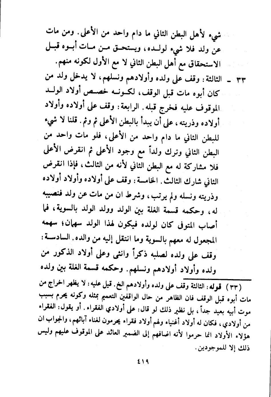 شَيْءَ لِأَهْلِ الْبَطْنِ الثَّانِي مَا دَامَ وَاحِدٌ مِنْ الْأَعْلَى. وَمَنْ مَاتَ عَنْ وَلَدٍ فَلَا شَيْءَ لِوَلَدِهِ، وَيَسْتَحِقُّ مَنْ مَاتَ أَبُوهُ قَبْلَ الِاسْتِحْقَاقِ مَعَ أَهْلِ الْبَطْنِ الثَّانِي لَا مَعَ الْأَوَّلِ لِكَوْنِهِ مِنْهُمْ. 33 -