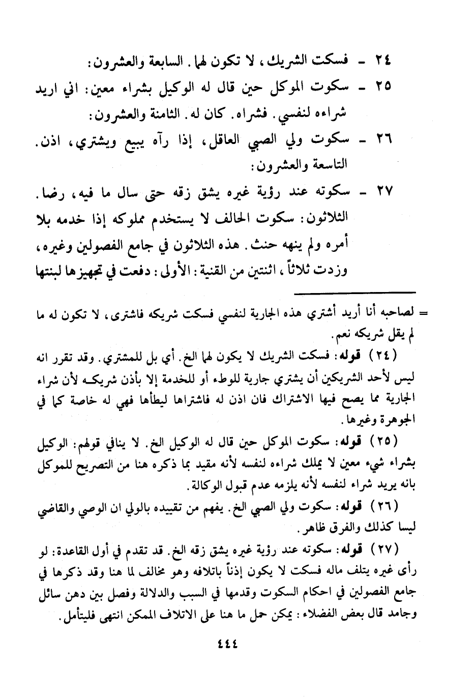 ـــــــــــــــــــــــــــــQلِصَاحِبِهِ أَنَا أُرِيدُ أَنْ أَشْتَرِيَ هَذِهِ الْجَارِيَةَ لِنَفْسِي فَسَكَتَ شَرِيكُهُ فَاشْتَرَى، لَا تَكُونُ لَهُ مَا لَمْ يَقُلْ شَرِيكُهُ نَعَمْ.