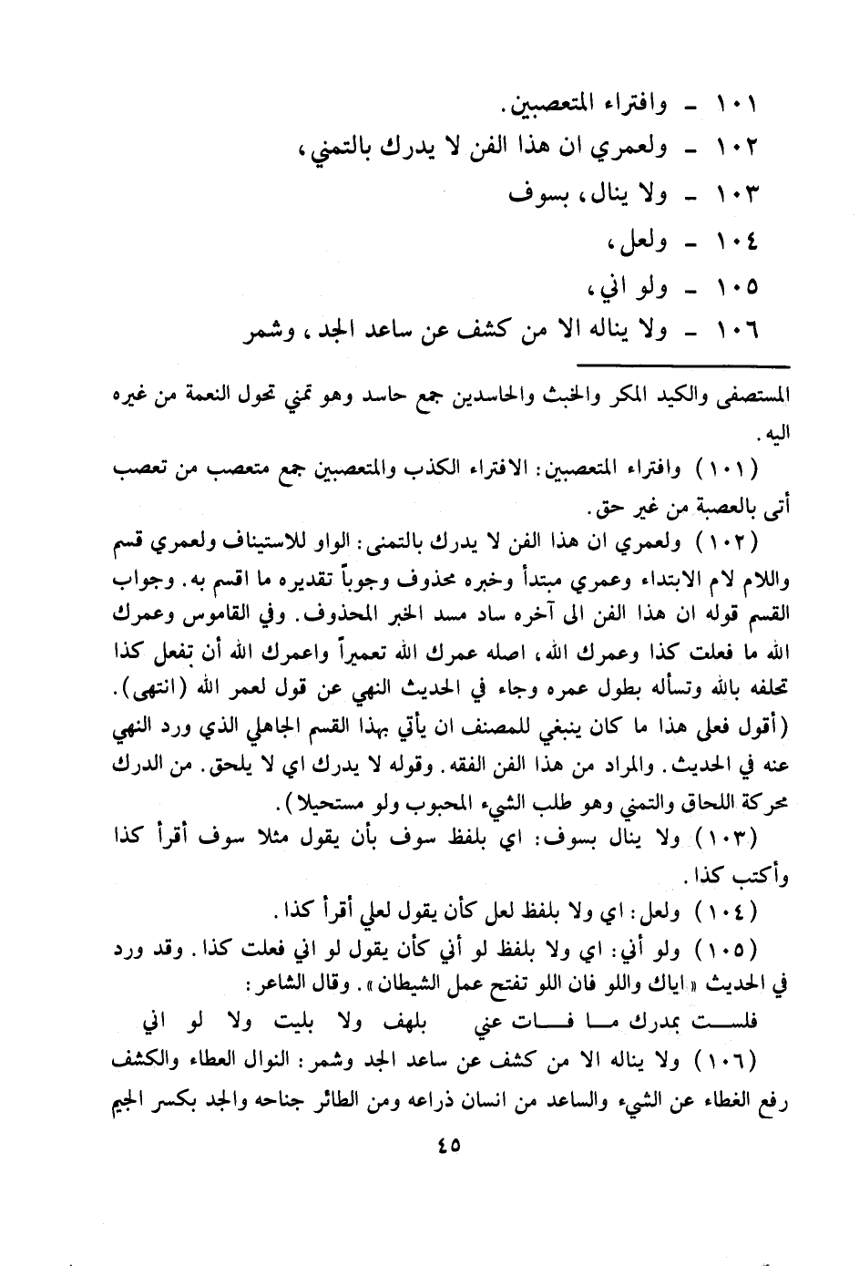 وَلَعَمْرِي إنَّ هَذَا الْفَنَّ لَا يُدْرَكُ بِالتَّمَنِّي، 103 - وَلَا يُنَالُ، بِسَوْفَ 104 - وَلَعَلَّ، 105 - وَلَوْ أَنِّي، 106 - وَلَا يَنَالُهُ إلَّا مَنْ كَشَفَ عَنْ سَاعِدِ الْجِدِّ، وَشَمَّرَ