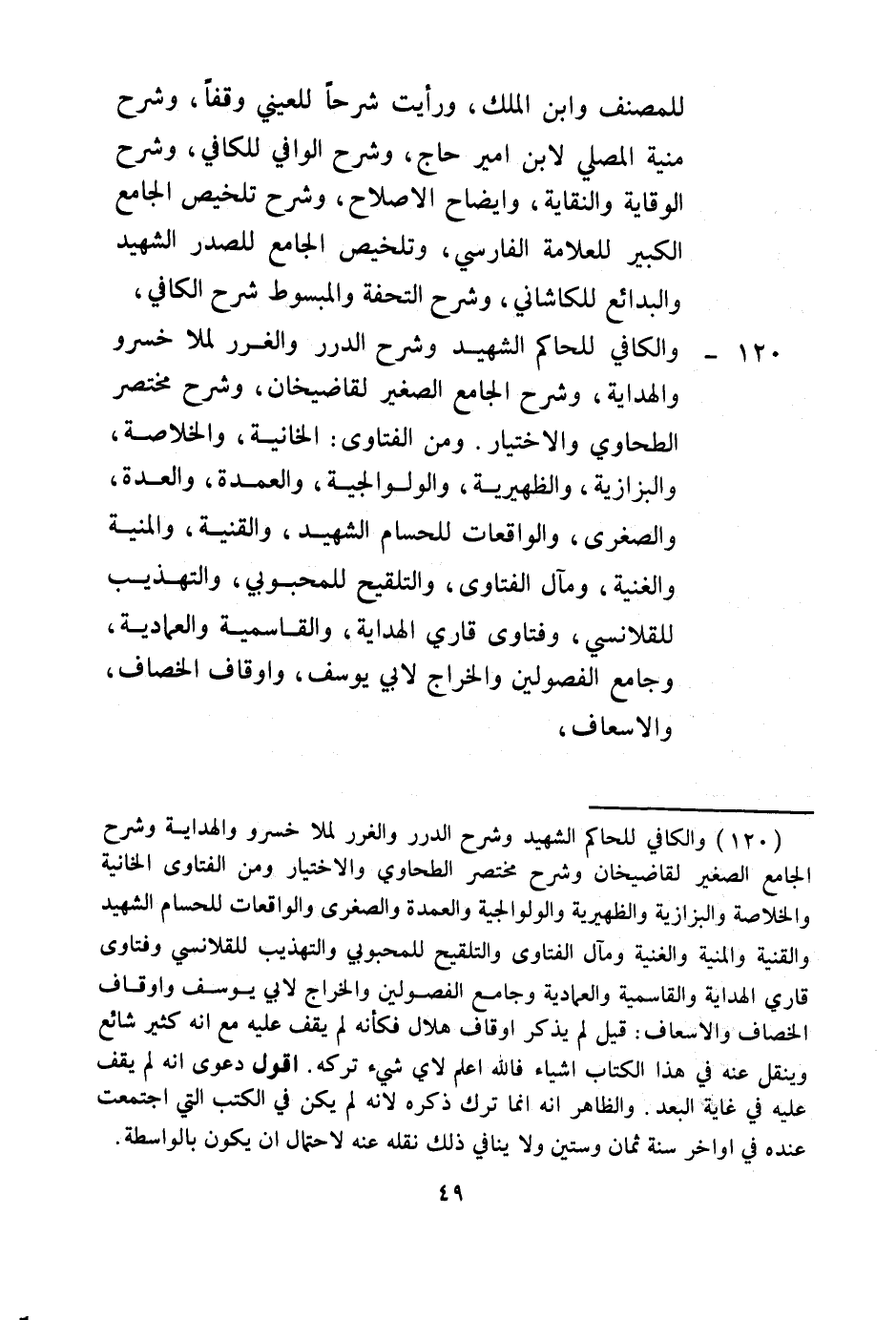 لِلْمُصَنِّفِ وَابْنِ الْمَلِكِ، وَرَأَيْت شَرْحًا لِلْعَيْنِيِّ وَقْفًا، وَشَرْحُ مُنْيَةِ الْمُصَلِّي لِابْنِ أَمِيرِ الْحَاجِّ، وَشَرْحُ الْوَافِي لِلْكَافِي، وَشَرْحُ الْوُقَايَةِ وَالنُّقَايَةِ، وَإِيضَاحُ الْإِصْلَاحِ، وَشَرْحُ تَلْخِيصِ الْجَامِعِ الْكَبِيرِ لِلْعَلَّامَةِ الْفَارِسِيِّ، وَتَلْخِيصُ الْجَامِعِ لِلصَّدْرِ الشَّهِيدِ وَالْبَدَائِعُ لِلْكَاسَانِيِّ، وَشَرْحُ التُّحْفَةِ وَالْمَبْسُوطُ شَرْحُ الْكَافِي، 120 - وَالْكَافِي لِلْحَاكِمِ الشَّهِيدِ وَشَرْحُ الدُّرَرِ وَالْغُرَرِ لِمُلَّا خُسْرو وَالْهِدَايَةُ، وَشَرْحُ الْجَامِعِ الصَّغِيرِ لِقَاضِي خَانْ، وَشَرْحُ مُخْتَصَرِ الطَّحَاوِيِّ وَالِاخْتِيَارُ. وَمِنْ الْفَتَاوَى: الْخَانِيَّةُ، وَالْخُلَاصَةُ، وَالْبَزَّازِيَّةُ، وَالظَّهِيرِيَّةُ، وَالْوَلْوالِجِيَّة، وَالْعُمْدَةُ، وَالْعُدَّةُ، وَالصُّغْرَى، وَالْوَاقِعَاتُ لِلْحُسَامِ الشَّهِيدِ، وَالْقُنْيَةُ، وَالْمُنْيَةُ وَالْغُنْيَةُ، وَمَآلُ الْفَتَاوَى، وَالتَّلْقِيحُ لِلْمَحْبُوبِيِّ، وَالتَّهْذِيبُ لِلْقَلَانِسِيِّ، وَفَتَاوَى قَارِي الْهِدَايَةِ، وَالْقَاسِمِيَّةُ وَالْعِمَادِيَّةُ، وَجَامِعُ الْفُصُولَيْنِ وَالْخَرَاجُ لِأَبِي يُوسُفَ، وَأَوْقَافُ الْخَصَّافِ، وَالْإِسْعَافُ