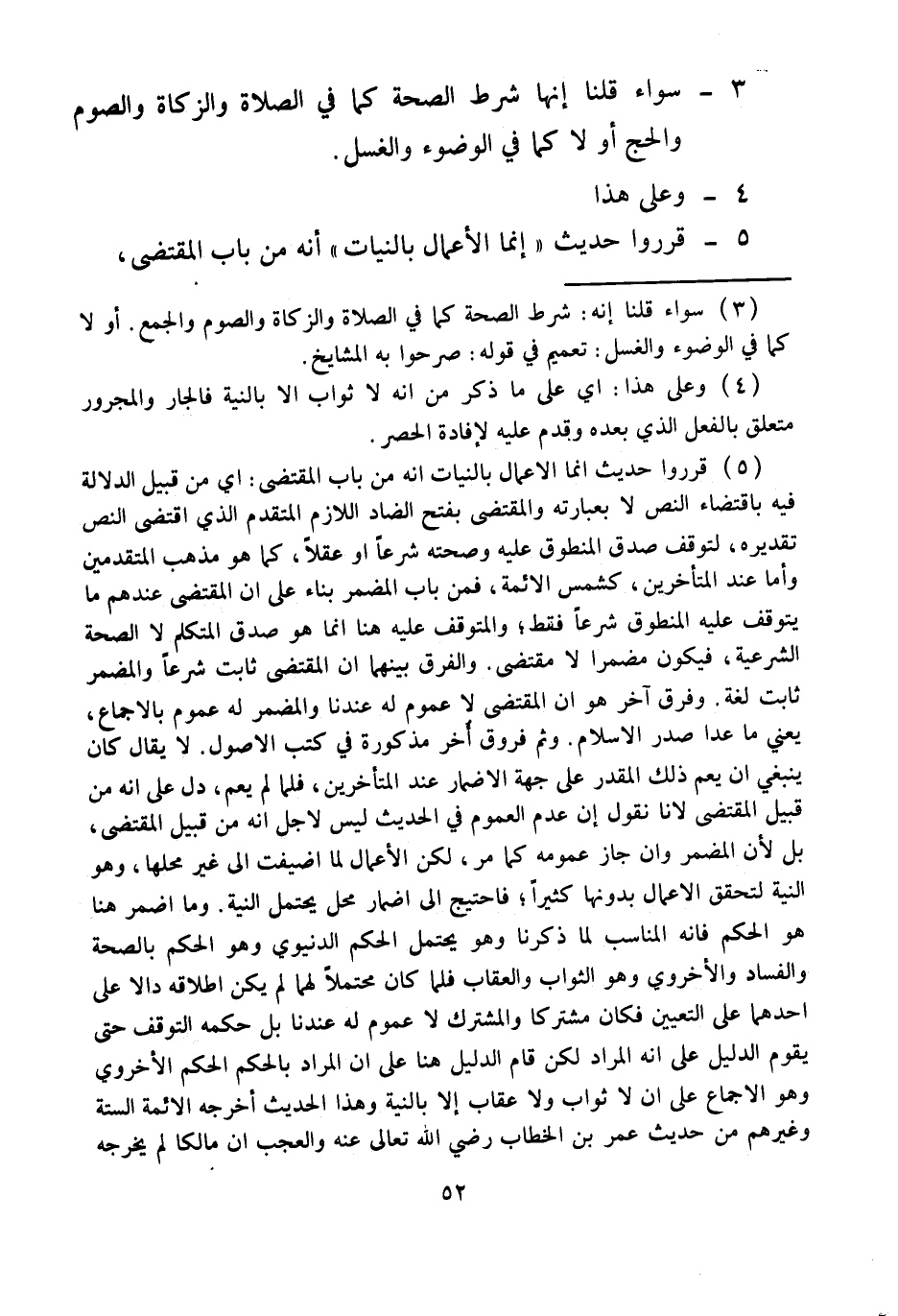 (5) قَرَّرُوا حَدِيثَ «إنَّمَا الْأَعْمَالُ بِالنِّيَّاتِ» أَنَّهُ مِنْ بَابِ الْمُقْتَضَى: أَيْ مِنْ قَبِيلِ الدَّلَالَةِ فِيهِ بِاقْتِضَاءِ النَّصِّ لَا بِعِبَارَتِهِ وَالْمُقْتَضَى بِفَتْحِ الضَّادِ اللَّازِمُ الْمُتَقَدِّمُ الَّذِي اقْتَضَى النَّصُّ تَقْدِيرَهُ، لِتَوَقُّفِ صِدْقِ الْمَنْطُوقِ عَلَيْهِ وَصِحَّتِهِ شَرْعًا أَوْ عَقْلًا، كَمَا هُوَ مَذْهَبُ الْمُتَقَدِّمِينَ وَأَمَّا عِنْدَ الْمُتَأَخِّرِينَ، كَشَمْسِ الْأَئِمَّةِ، فَمِنْ بَابِ الْمُضْمَرِ بِنَاءً عَلَى أَنَّ الْمُقْتَضَى عِنْدَهُمْ مَا يَتَوَقَّفُ عَلَيْهِ الْمَنْطُوقُ شَرْعًا فَقَطْ؛ وَالْمُتَوَقَّف عَلَيْهِ هُنَا إنَّمَا هُوَ صِدْقُ الْمُتَكَلِّمِ لَا الصِّحَّةُ الشَّرْعِيَّةُ، فَيَكُونَ مُضْمَرًا لَا مُقْتَضًى.