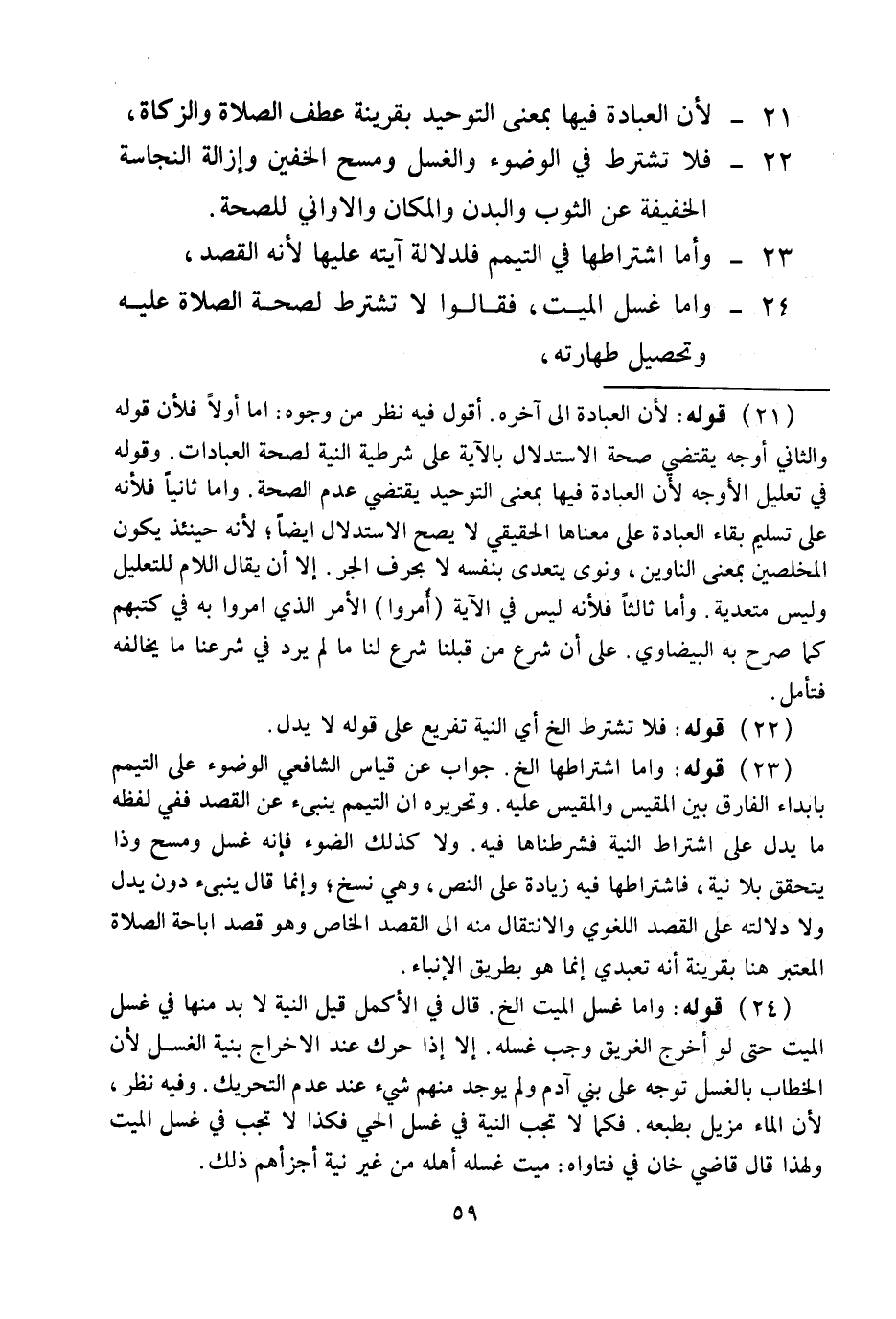 أَقُولُ فِيهِ نَظَرٌ مِنْ وُجُوهٍ: أَمَّا أَوَّلًا فَلِأَنَّ قَوْلَهُ وَالثَّانِي أَوْجُهُ يَقْتَضِي صِحَّةَ الِاسْتِدْلَالِ بِالْآيَةِ عَلَى شَرْطِيَّةِ النِّيَّةِ لِصِحَّةِ الْعِبَادَاتِ.