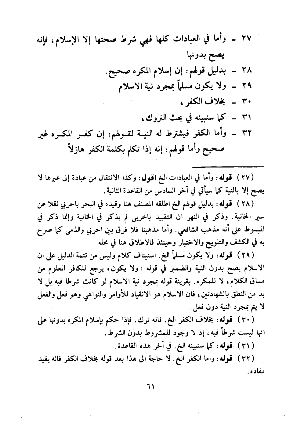 29 - وَلَا يَكُونُ مُسْلِمًا بِمُجَرَّدِ نِيَّةِ الْإِسْلَامِ 30 - بِخِلَافِ الْكُفْرِ، 31 - كَمَا سَنُبَيِّنُهُ فِي بَحْثِ التُّرُوكِ