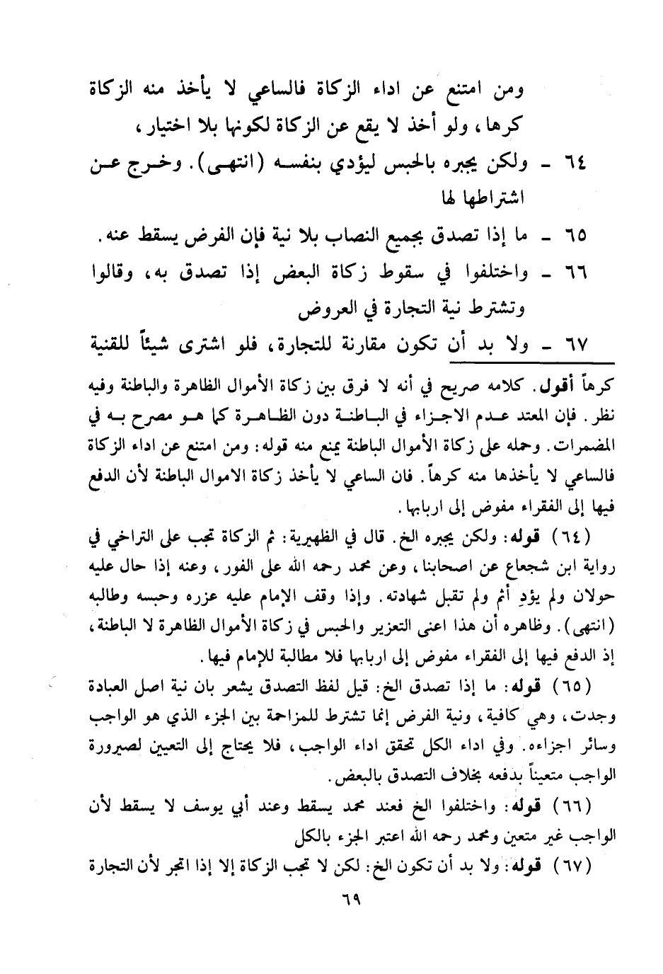 66 - وَاخْتَلَفُوا فِي سُقُوطِ زَكَاةِ الْبَعْضِ إذَا تَصَدَّقَ بِهِ، وَقَالُوا وَتُشْتَرَطُ نِيَّةُ التِّجَارَةِ فِي الْعُرُوضِ