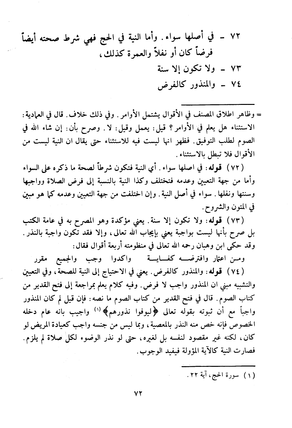 وَأَمَّا النِّيَّةُ فِي الْحَجِّ فَهِيَ شَرْطُ صِحَّتِهِ أَيْضًا فَرْضًا كَانَ أَوْ نَفْلًا وَالْعُمْرَةُ كَذَلِكَ، 73 - وَلَا تَكُونُ إلَّا سُنَّةً