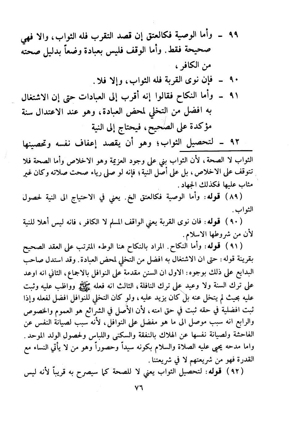 91 - وَأَمَّا النِّكَاحُ فَقَالُوا إنَّهُ أَقْرَبُ إلَى الْعِبَادَاتِ حَتَّى أَنَّ الِاشْتِغَالَ بِهِ أَفْضَلُ مِنْ التَّخَلِّي لِمَحْضِ الْعِبَادَةِ، وَهُوَ عِنْدَ الِاعْتِدَالِ سُنَّةٌ مُؤَكَّدَةٌ عَلَى الصَّحِيحِ، فَيَحْتَاجُ إلَى النِّيَّةِ 92 - لِتَحْصِيلِ الثَّوَابِ؛ وَهُوَ أَنْ يَقْصِدَ إعْفَافَ نَفْسِهِ وَتُحْصِينَهَا