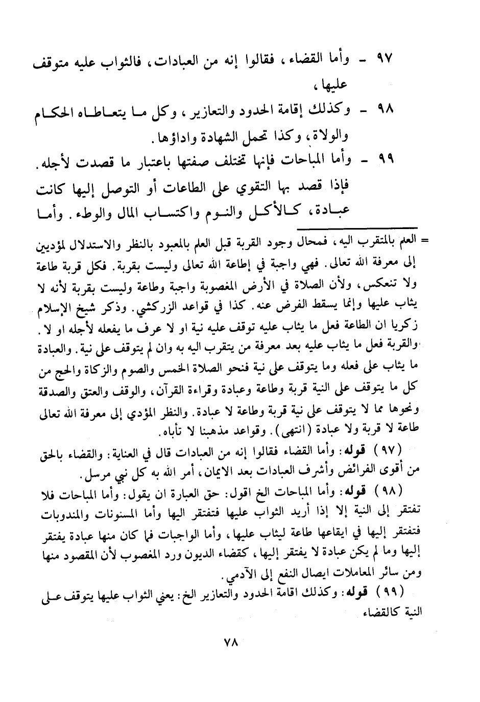 وَالْعِبَادَةُ مَا يُثَابُ عَلَى فِعْلِهِ وَمَا يُتَوَقَّفُ عَلَى نِيَّةٍ فَنَحْوُ الصَّلَوَاتِ الْخَمْسِ وَالصَّوْمِ وَالزَّكَاةِ وَالْحَجِّ مِنْ كُلِّ مَا يَتَوَقَّفُ عَلَى النِّيَّةِ قُرْبَةٌ وَطَاعَةٌ وَعِبَادَةٌ وَقِرَاءَةُ الْقُرْآنِ، وَالْوَقْفُ وَالْعِتْقُ وَالصَّدَقَةُ وَنَحْوُهَا مِمَّا لَا يَتَوَقَّفُ عَلَى نِيَّةٍ قُرْبَةٌ وَطَاعَةٌ لَا عِبَادَةٌ.
