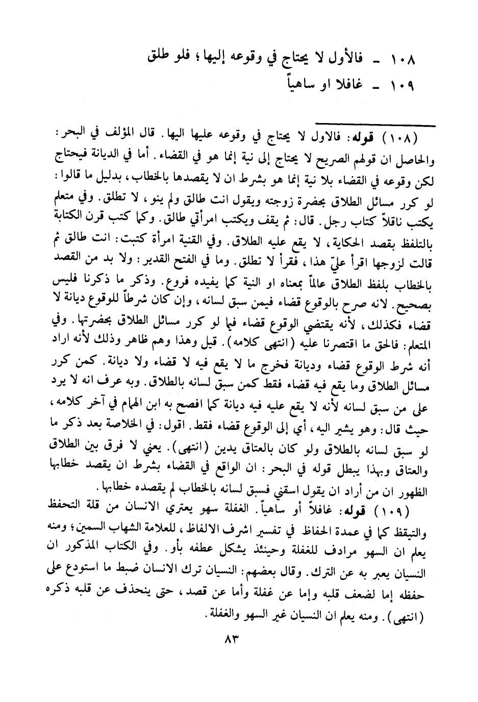 فَالْأَوَّلُ لَا يَحْتَاجُ فِي وُقُوعِهِ إلَيْهَا؛ فَلَوْ طَلَّقَ 109 - غَافِلًا أَوْ سَاهِيًا
