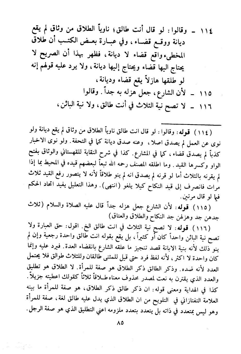 وَقَالُوا 116 - لَا تَصِحُّ نِيَّةُ الثَّلَاثِ فِي أَنْتِ طَالِقٌ، وَلَا نِيَّةُ الْبَائِنِ،