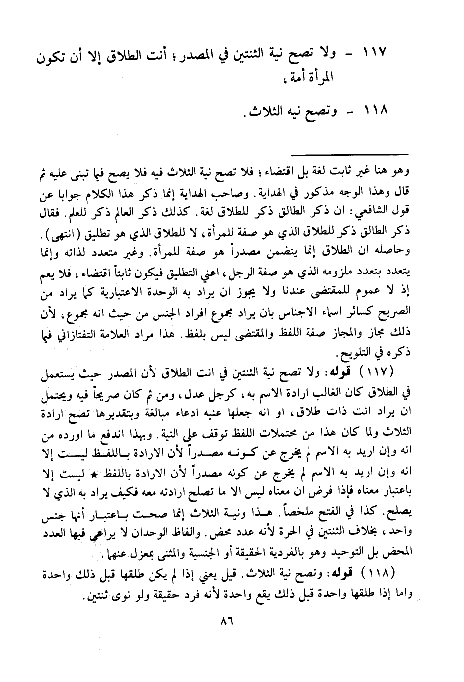 وَلَا تَصِحُّ نِيَّةُ الثِّنْتَيْنِ فِي الْمَصْدَرِ؛ أَنْتِ الطَّلَاقُ إلَّا أَنْ تَكُونَ الْمَرْأَةُ أَمَةً، 118 - وَتَصِحُّ نِيَّةُ الثَّلَاثِ.