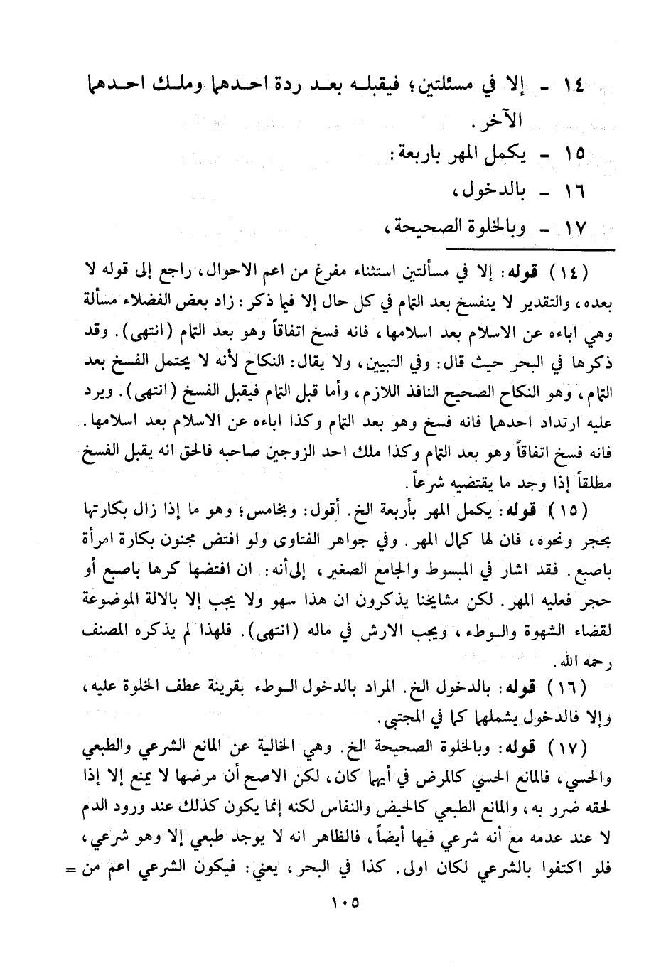 15 - يَكْمُلُ الْمَهْرُ بِأَرْبَعَةٍ: 16 - بِالدُّخُولِ 17 - وَبِالْخَلْوَةِ الصَّحِيحَةِ