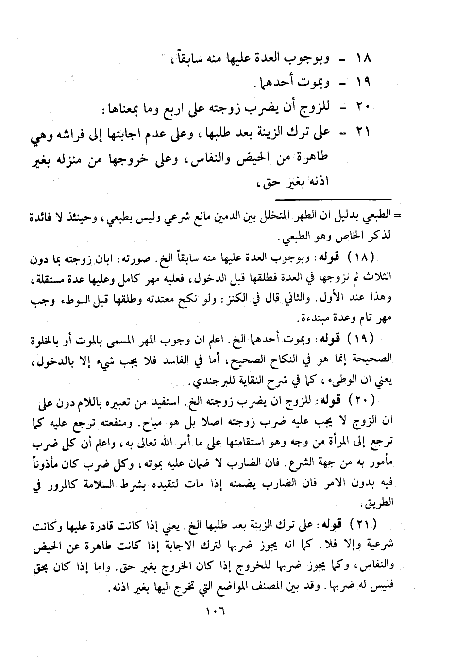20 - لِلزَّوْجِ أَنْ يَضْرِبَ زَوْجَتَهُ عَلَى أَرْبَعٍ وَمَا بِمَعْنَاهَا: 21 - عَلَى تَرْكِ الزِّينَةِ بَعْدَ طَلَبِهَا، وَعَلَى عَدَمِ إجَابَتِهَا إلَى فِرَاشِهِ وَهِيَ طَاهِرَةٌ مِنْ الْحَيْضِ وَالنِّفَاسِ، وَعَلَى خُرُوجِهَا مِنْ مَنْزِلِهِ بِغَيْرِ إذْنِهِ بِغَيْرِ حَقٍّ