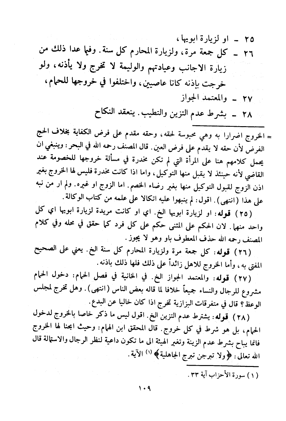 وَفِيمَا عَدَا ذَلِكَ مِنْ زِيَارَةِ الْأَجَانِبِ وَعِيَادَتِهِمْ وَالْوَلِيمَةِ لَا تَخْرُجُ وَلَا يَأْذَنْهُ، وَلَوْ خَرَجَتْ بِإِذْنِهِ كَانَا عَاصِيَيْنِ، وَاخْتَلَفُوا فِي خُرُوجِهَا لِلْحَمَّامِ 27 - وَالْمُعْتَمَدُ الْجَوَازُ 28 - بِشَرْطِ عَدَمِ التَّزَيُّنِ وَالتَّطَيُّبِ