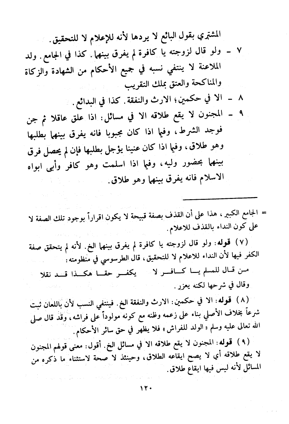9 - الْمَجْنُونُ لَا يَقَعُ طَلَاقُهُ إلَّا فِي مَسَائِلَ: إذَا عَلَّقَ عَاقِلًا ثُمَّ جُنَّ فَوُجِدَ الشَّرْطُ، وَفِيمَا إذَا كَانَ مَجْبُوبًا فَإِنَّهُ يُفَرَّقُ بَيْنَهُمَا بِطَلَبِهَا وَهُوَ طَلَاقٌ، وَفِيمَا إذَا كَانَ عِنِّينًا يُؤَجَّلُ بِطَلَبِهَا فَإِنْ لَمْ يَحْصُلْ فُرِّقَ بَيْنَهُمَا بِحُضُورِ وَلِيِّهِ، وَفِيمَا إذَا أَسْلَمَتْ وَهُوَ كَافِرٌ وَأَبَى أَبَوَاهُ الْإِسْلَامَ فَإِنَّهُ يُفَرَّقُ بَيْنَهُمَا وَهُوَ طَلَاقٌ.