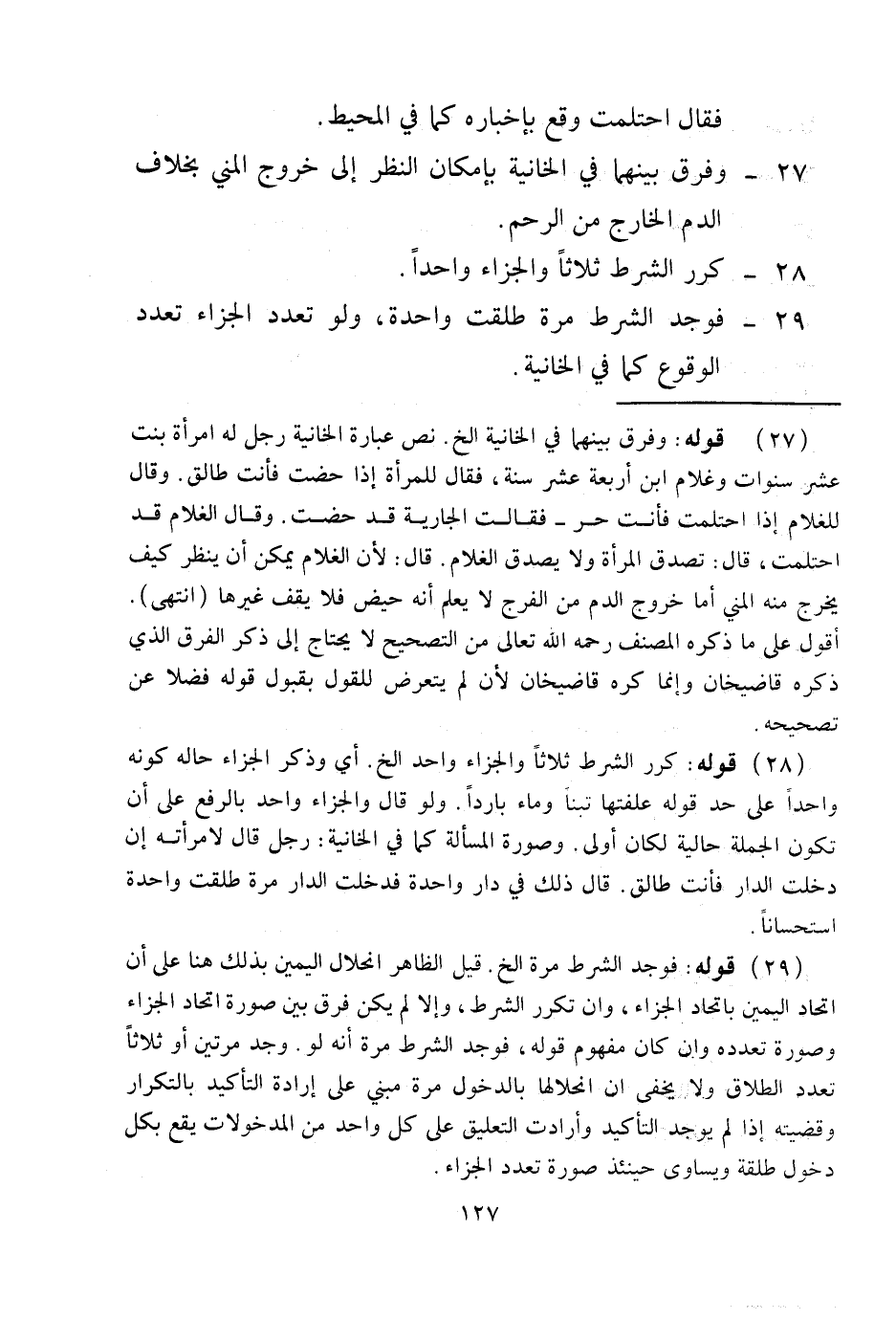 28 - كُرِّرَ الشَّرْطُ ثَلَاثًا وَالْجَزَاءُ وَاحِدًا 29 - فَوُجِدَ الشَّرْطُ مَرَّةً طَلُقَتْ وَاحِدَةً، وَلَوْ تَعَدَّدَ الْجَزَاءُ تَعَدَّدَ الْوُقُوعُ كَمَا فِي الْخَانِيَّةِ