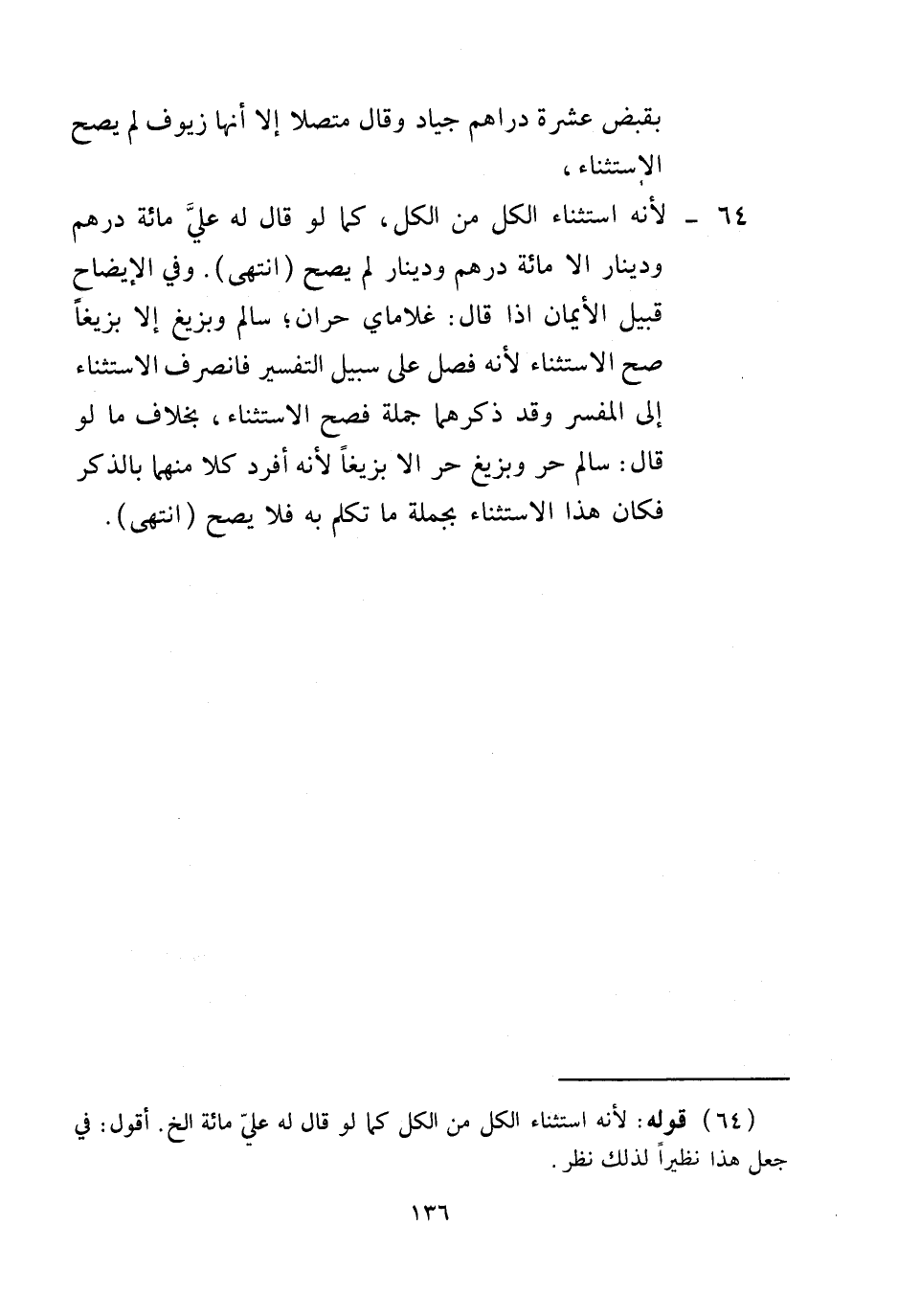 بِقَبْضِ عَشَرَةِ دَرَاهِمَ جِيَادٍ وَقَالَ مُتَّصِلًا إلَّا أَنَّهَا زُيُوفٌ لَمْ يَصِحَّ الِاسْتِثْنَاءُ، 64 - لِأَنَّهُ اسْتِثْنَاءُ الْكُلِّ مِنْ الْكُلِّ، كَمَا لَوْ قَالَ: لَهُ عَلَيَّ مِائَةُ دِرْهَمٍ وَدِينَارٍ إلَّا مِائَةَ دِرْهَمٍ وَدِينَارٍ لَمْ يَصِحَّ (انْتَهَى) .