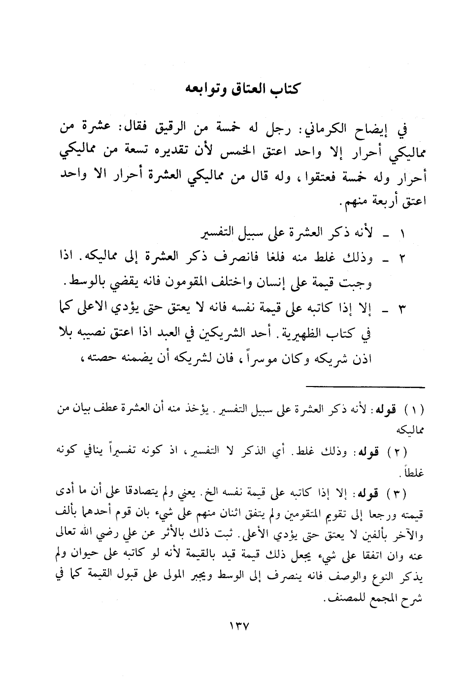 كِتَابُ الْعَتَاقِ وَتَوَابِعِهِ فِي إيضَاحِ الْكَرْمَانِيِّ: رَجُلٌ لَهُ خَمْسَةٌ مِنْ الرَّقِيقِ فَقَالَ: عَشَرَةٌ مِنْ مَمَالِيكِي أَحْرَارٌ إلَّا وَاحِدٌ أُعْتِقَ الْخَمْسُ؛ لِأَنَّ تَقْدِيرَهُ تِسْعَةً مِنْ مَمَالِيكِي أَحْرَارٌ وَلَهُ خَمْسَةٌ فَعَتَقُوا، وَلَوْ قَالَ: مِنْ مَمَالِيكِي الْعَشَرَةِ أَحْرَارٌ إلَّا وَاحِدٌ أُعْتِقَ أَرْبَعَةٌ مِنْهُمْ. 1 -