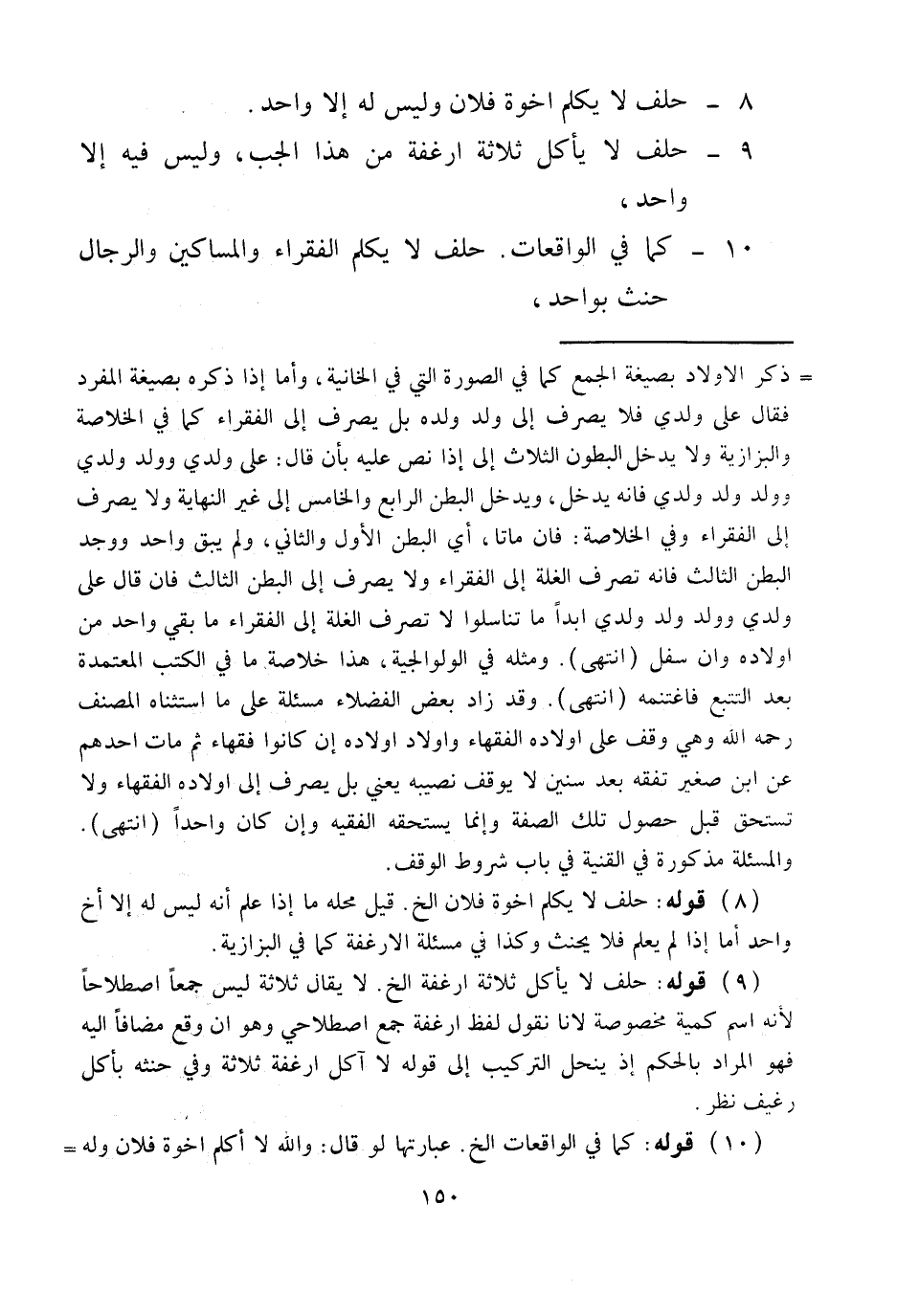 وَقَدْ زَادَ بَعْضُ الْفُضَلَاءِ مَسْأَلَةً عَلَى مَا اسْتَثْنَاهُ الْمُصَنِّفُ - رَحِمَهُ اللَّهُ - وَهِيَ: وَقَفَ عَلَى أَوْلَادِهِ الْفُقَهَاءِ وَأَوْلَادِ أَوْلَادِهِ إنْ كَانُوا فُقَهَاءَ ثُمَّ مَاتَ أَحَدُهُمْ عَنْ ابْنٍ صَغِيرٍ تَفَقَّهَ بَعْدَ سِنِينَ لَا يُوقَفُ نَصِيبُهُ يَعْنِي بَلْ يُصْرَفُ إلَى أَوْلَادِهِ الْفُقَهَاءِ وَلَا تُسْتَحَقُّ قَبْلَ حُصُولِ تِلْكَ الصِّفَةِ وَإِنَّمَا يَسْتَحِقُّهُ الْفَقِيهُ وَإِنْ كَانَ وَاحِدًا (انْتَهَى) .
