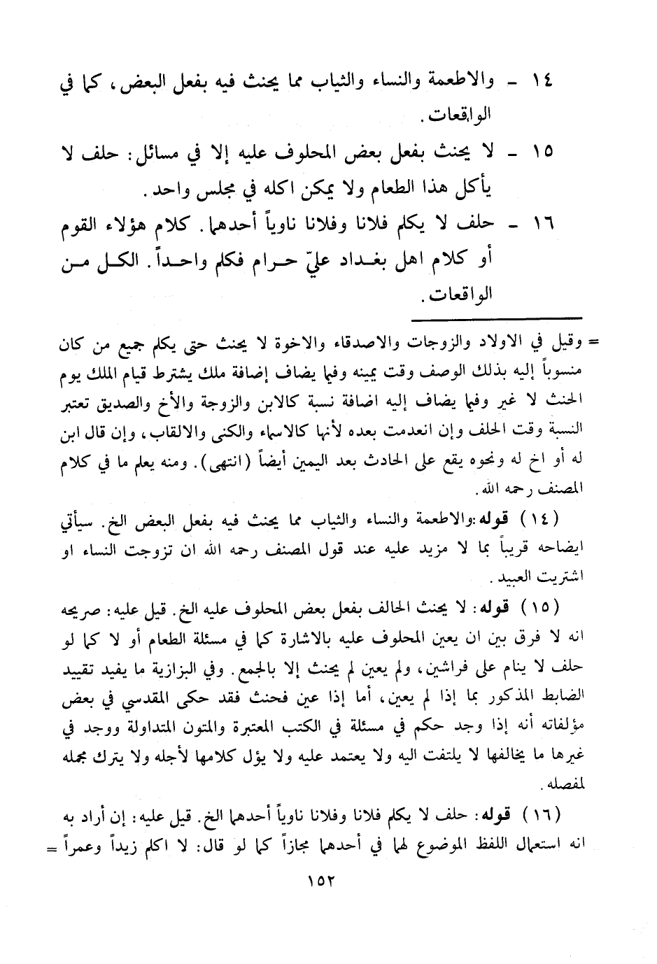 15 - لَا يَحْنَثُ بِفِعْلِ بَعْضِ الْمَحْلُوفِ عَلَيْهِ إلَّا فِي مَسَائِلَ: حَلَفَ لَا يَأْكُلُ هَذَا الطَّعَامَ وَلَا يُمْكِنُ أَكْلُهُ فِي مَجْلِسٍ وَاحِدٍ.