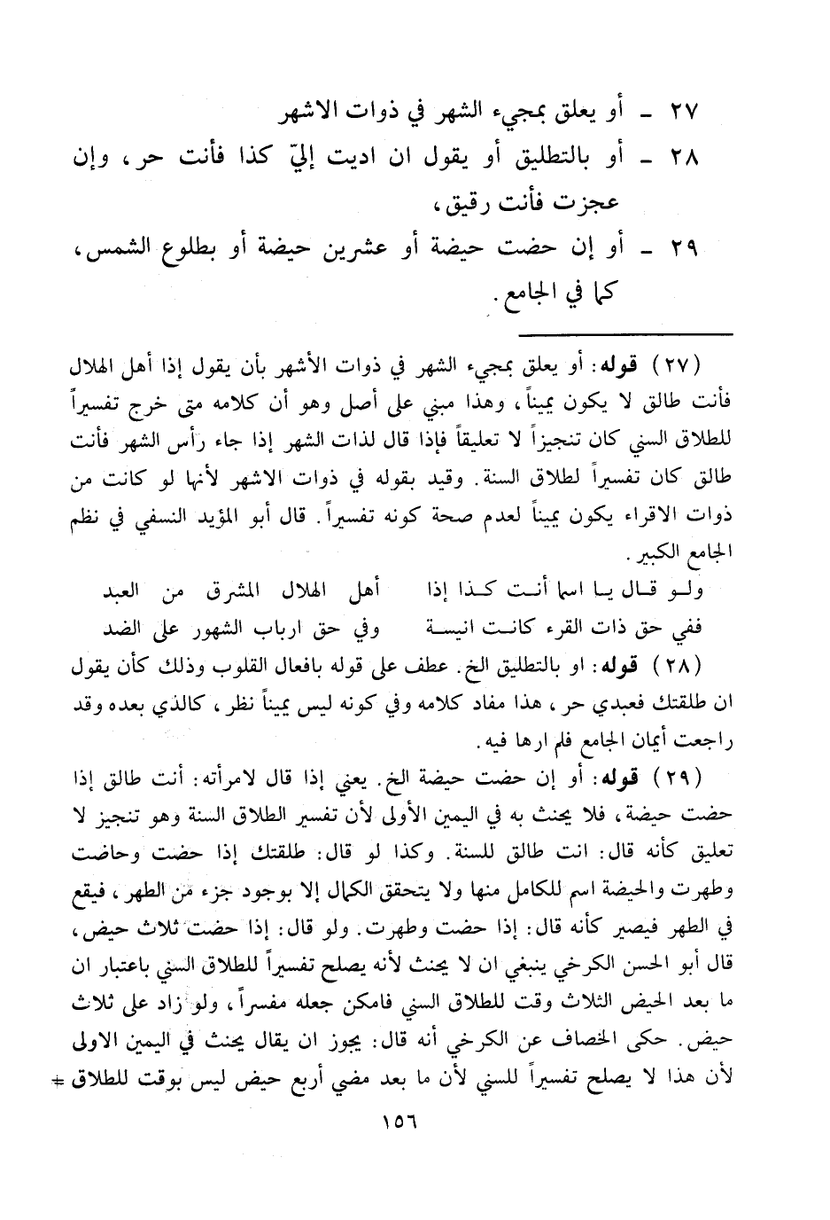 أَوْ يُعَلِّقَ بِمَجِيءِ الشَّهْرِ فِي ذَوَاتِ الْأَشْهُرِ 28 - أَوْ بِالتَّطْلِيقِ أَوْ يَقُولَ إنْ أَدَّيْت إلَيَّ كَذَا فَأَنْتَ حُرٌّ، وَإِنْ عَجَزْت فَأَنْتَ رَقِيقٌ، 29 - أَوْ إنْ حِضْت حَيْضَةً أَوْ عِشْرِينَ حَيْضَةً أَوْ بِطُلُوعِ الشَّمْسِ، كَمَا فِي الْجَامِعِ