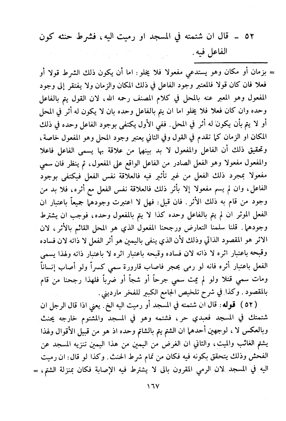 فَإِنْ قِيلَ: فَهَلَّا اعْتَبَرْت وُجُودَهُمَا جَمِيعًا بِاعْتِبَارِ أَنَّ الْفِعْلَ الْمُؤَثِّرَ إنْ لَمْ يَتِمَّ بِالْفَاعِلِ وَحْدَهُ كَذَا لَا يَتِمُّ بِالْمَفْعُولِ وَحْدَهُ، فَوَجَبَ أَنْ يُشْتَرَطَ وُجُودُهُمَا. قُلْنَا سَلَّمْنَا التَّعَارُضَ وَرَجَّحْنَا الْمَفْعُولَ الَّذِي هُوَ الْمَحَلُّ الْقَائِمُ بِالْأَثَرِ؛ لِأَنَّ الْأَثَرَ هُوَ الْمَقْصُودُ الذَّاتِيُّ وَذَلِكَ لِأَنَّ الَّذِي يُنْفَى بِالْيَمِينِ هُوَ أَثَرُ الْفِعْلِ لَا ذَاتُهُ؛ لِأَنَّ فَسَادَهُ وَقُبْحَهُ بِاعْتِبَارِ أَثَرِهِ لَا بِاعْتِبَارِ ذَاتِهِ، وَلِهَذَا يُسَمَّى الْفِعْلُ بِاعْتِبَارِ أَثَرِهِ فَإِنَّهُ لَوْ رَمَى بِحَجَرٍ فَأَصَابَ قَارُورَةً سُمِّيَ كَسْرًا وَلَوْ أَصَابَ إنْسَانًا وَمَاتَ سُمِّيَ قَتْلًا وَلَوْ لَمْ يَمُتْ سُمِّيَ جُرْحًا أَوْ شَجًّا أَوْ ضَرْبًا فَلِهَذَا رَجَّحْنَا مَنْ قَامَ بِالْمَقْصُودِ. وَكَذَا فِي شَرْحِ تَلْخِيصِ الْجَامِعِ الْكَبِيرِ لِلْفَخْرِ الْمَارْدِينِيِّ.