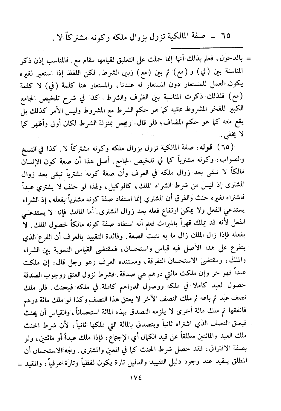 (65) قَوْلُهُ: صِفَةُ الْمَالِكِيَّةِ تَزُولُ بِزَوَالِ مِلْكِهِ وَكَوْنِهِ مُشْتَرَكًا لَا. كَذَا فِي النُّسَخِ وَالصَّوَابُ: وَكَوْنُهُ مُشْتَرِيًا كَمَا فِي تَلْخِيصِ الْجَامِعِ.