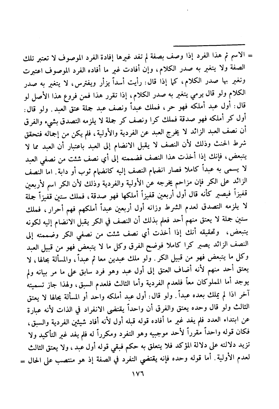 ـــــــــــــــــــــــــــــQالِاسْمَ ثُمَّ هَذَا الْفَرْدُ إذَا وُصِفَ بِصِفَةٍ لَمْ تُفِدْ غَيْرَهَا إفَادَةَ الْفَرْدِ الْمَوْصُوفِ لَا تُعْتَبَرُ تِلْكَ الصِّفَةُ وَلَا يَتَغَيَّرُ بِهِ صَدْرُ الْكَلَامِ، وَإِنْ أَفَادَتْ غَيْرَ مَا أَفَادَهُ الْفَرْدُ الْمَوْصُوفُ اُعْتُبِرَتْ وَتَغَيَّرَ بِهَا صَدْرُ الْكَلَامِ، كَمَا إذَا قَالَ: رَأَيْت أَسَدًا يَزْأَرُ وَيَفْتَرِسُ، لَا يَتَغَيَّرُ بِهِ صَدْرُ الْكَلَامِ وَلَوْ قَالَ يَرْمِي يَتَغَيَّرُ بِهِ صَدْرُ الْكَلَامِ، إذَا تَقَرَّرَ هَذَا فَمِنْ فُرُوعِ هَذَا الْأَصْلِ لَوْ قَالَ: أَوَّلُ عَبْدٍ أَمْلِكُهُ فَهُوَ حُرٌّ، فَمَلَكَ عَبْدًا وَنِصْفَ عَبْدٍ جُمْلَةً عَتَقَ الْعَبْدُ.