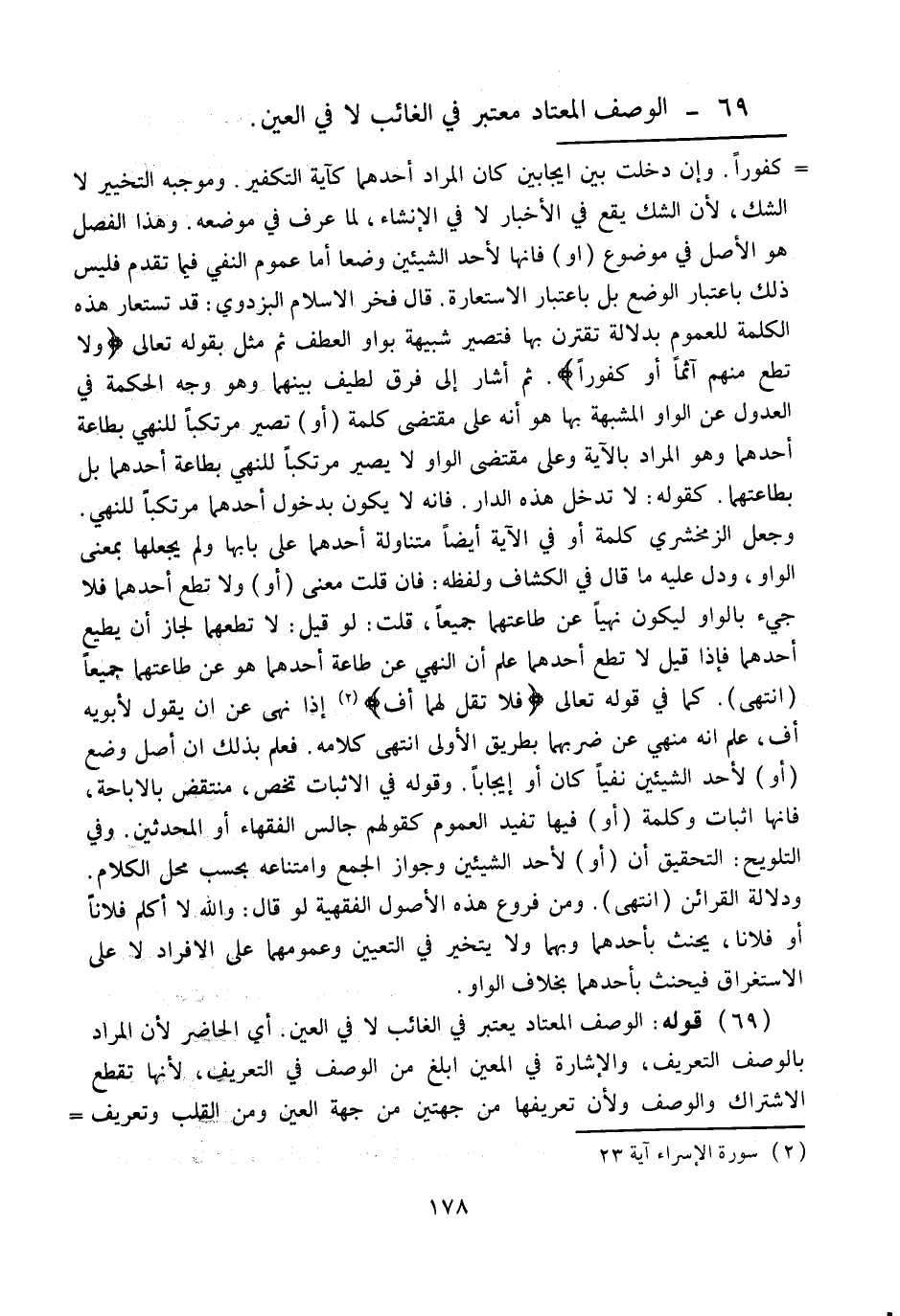 وَقَوْلُهُ فِي الْإِثْبَاتِ تَخُصُّ، مُنْتَقِضٌ بِالْإِبَاحَةِ، فَإِنَّهَا إثْبَاتٌ وَكَلِمَةُ (أَوْ) فِيهَا تُفِيدُ الْعُمُومَ كَقَوْلِهِمْ جَالِسِ الْفُقَهَاءَ أَوْ الْمُحَدِّثِينَ. وَفِي التَّلْوِيحِ: التَّحْقِيقُ أَنَّ (أَوْ) لِأَحَدِ الشَّيْئَيْنِ وَجَوَازُ الْجَمْعِ وَامْتِنَاعِهِ بِحَسَبِ مَحَلِّ الْكَلَامِ وَدَلَالَةِ الْقَرَائِنِ (انْتَهَى) .