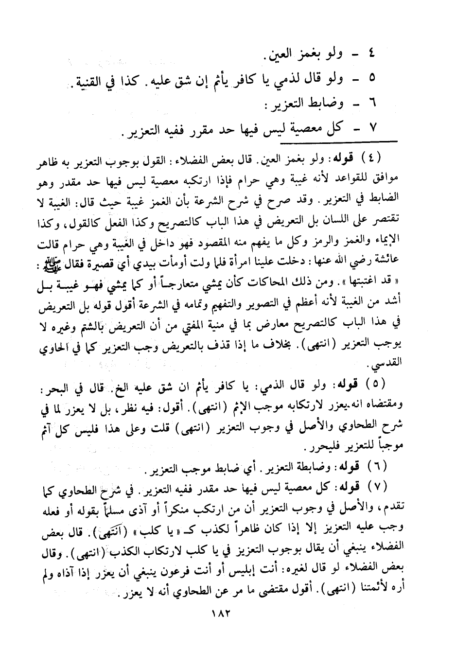 (7) قَوْلُهُ: كُلُّ مَعْصِيَةٍ لَيْسَ فِيهَا حَدٌّ مُقَدَّرٌ فَفِيهِ التَّعْزِيرُ. فِي شَرْحِ الطَّحَاوِيِّ كَمَا تَقَدَّمَ، وَالْأَصْلُ فِي وُجُوبِ التَّعْزِيرِ أَنَّ مَنْ ارْتَكَبَ مُنْكَرًا أَوْ آذَى مُسْلِمًا بِقَوْلِهِ أَوْ فِعْلِهِ وَجَبَ عَلَيْهِ التَّعْزِيرُ إلَّا إذَا كَانَ ظَاهِرَ الْكَذِبِ كَ " يَا كَلْبُ " (انْتَهَى) . قَالَ بَعْضُ الْفُضَلَاءِ يَنْبَغِي أَنْ يُقَالَ بِوُجُوبِ التَّعْزِيرِ فِي يَا كَلْبُ لِارْتِكَابِ الْكَذِبِ (انْتَهَى) .