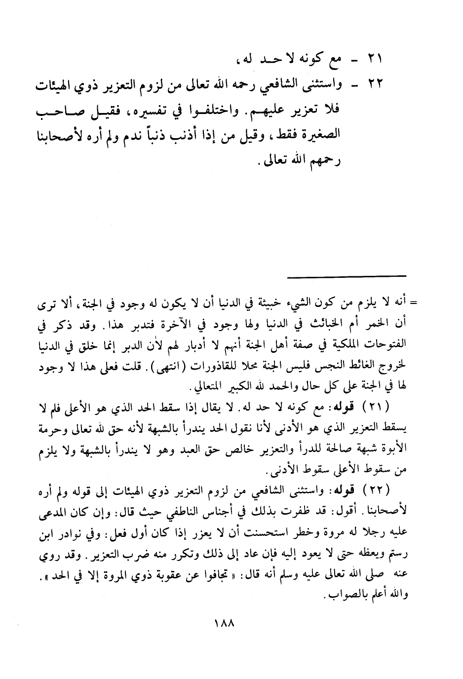 22 - وَاسْتَثْنَى الشَّافِعِيُّ - رَحِمَهُ اللَّهُ تَعَالَى - مِنْ لُزُومِ التَّعْزِيرِ ذَوِي الْهَيْئَاتِ فَلَا تَعْزِيرَ عَلَيْهِمْ. وَاخْتَلَفُوا فِي تَفْسِيرِهِ، فَقِيلَ صَاحِبُ الصَّغِيرَةِ فَقَطْ، وَقِيلَ مَنْ إذَا أَذْنَبَ ذَنْبًا نَدِمَ وَلَمْ أَرَهُ لِأَصْحَابِنَا رَحِمَهُمْ اللَّهُ تَعَالَى
