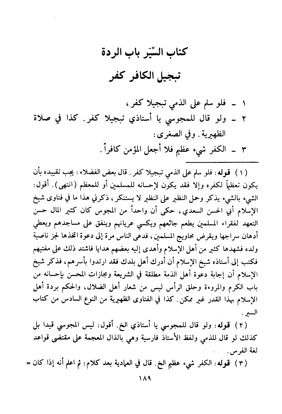 كِتَابُ السِّيَرِ بَابُ الرِّدَّةِ تَبْجِيلُ الْكَافِرِ كُفْرٌ 1 - فَلَوْ سَلَّمَ عَلَى. الذِّمِّيِّ تَبْجِيلًا كَفَرَ، 2 - وَلَوْ قَالَ لِلْمَجُوسِيِّ يَا أُسْتَاذِي تَبْجِيلًا كَفَرَ. كَذَا فِي صَلَاةِ الظَّهِيرِيَّةِ. وَفِي الصُّغْرَى: 3 - الْكُفْرُ شَيْءٌ عَظِيمٌ فَلَا أَجْعَلُ الْمُؤْمِنَ كَافِرًا.